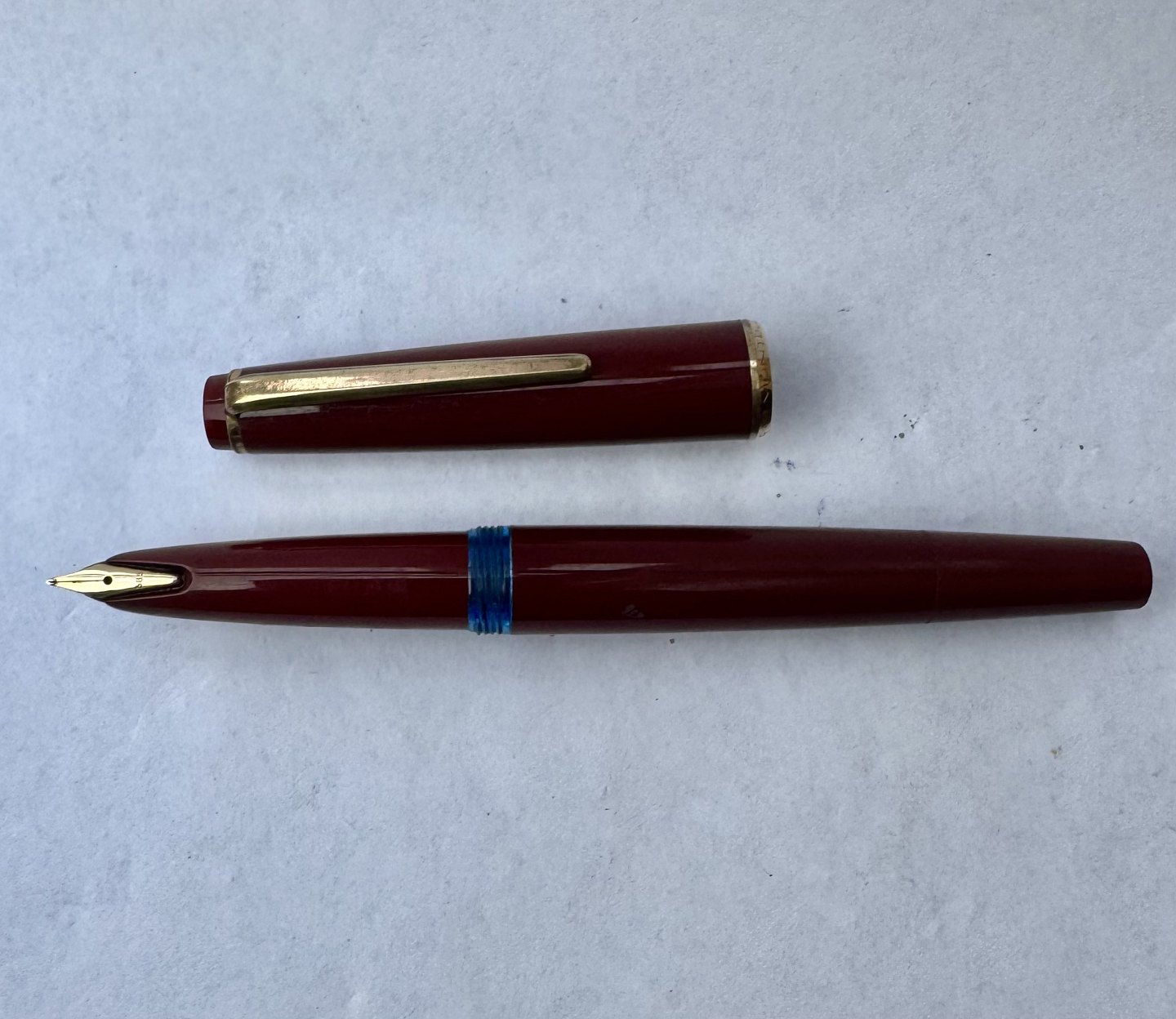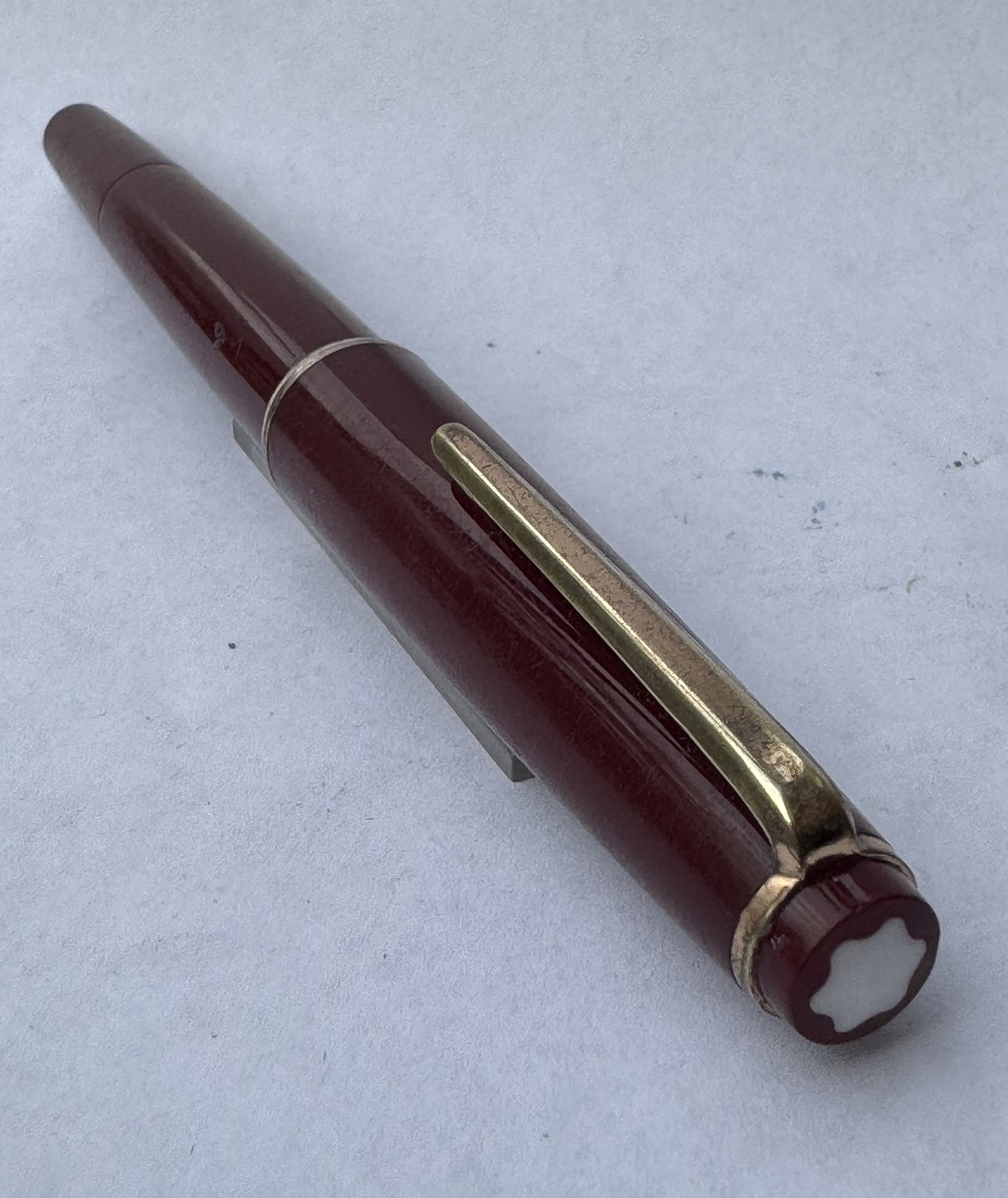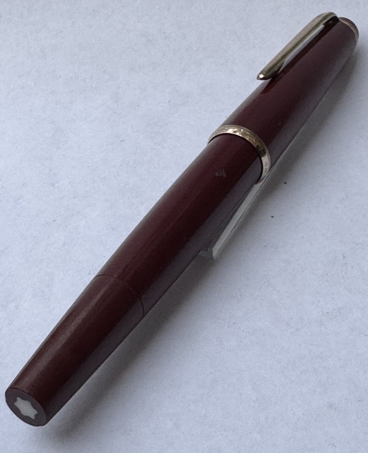 Bordeaux Montblanc 32 fyldepen. Fremstillet i Tyskland i 1970’erne. Påfyldning af blæk med piston filler. I god stand uden skader eller reparationer. L. 12,8 cm