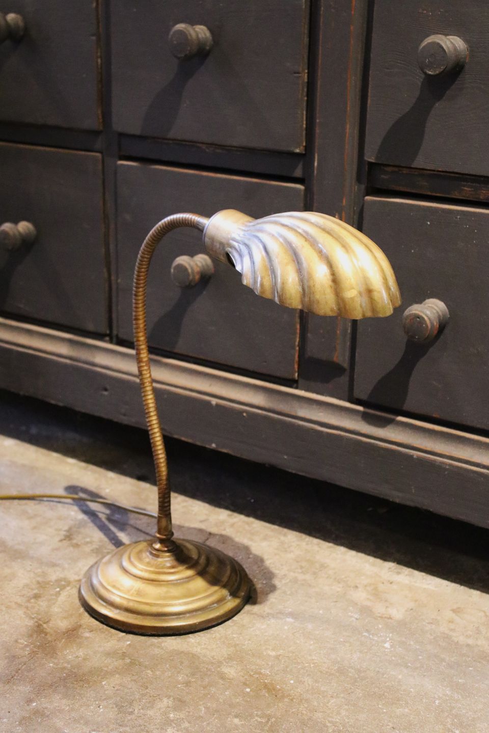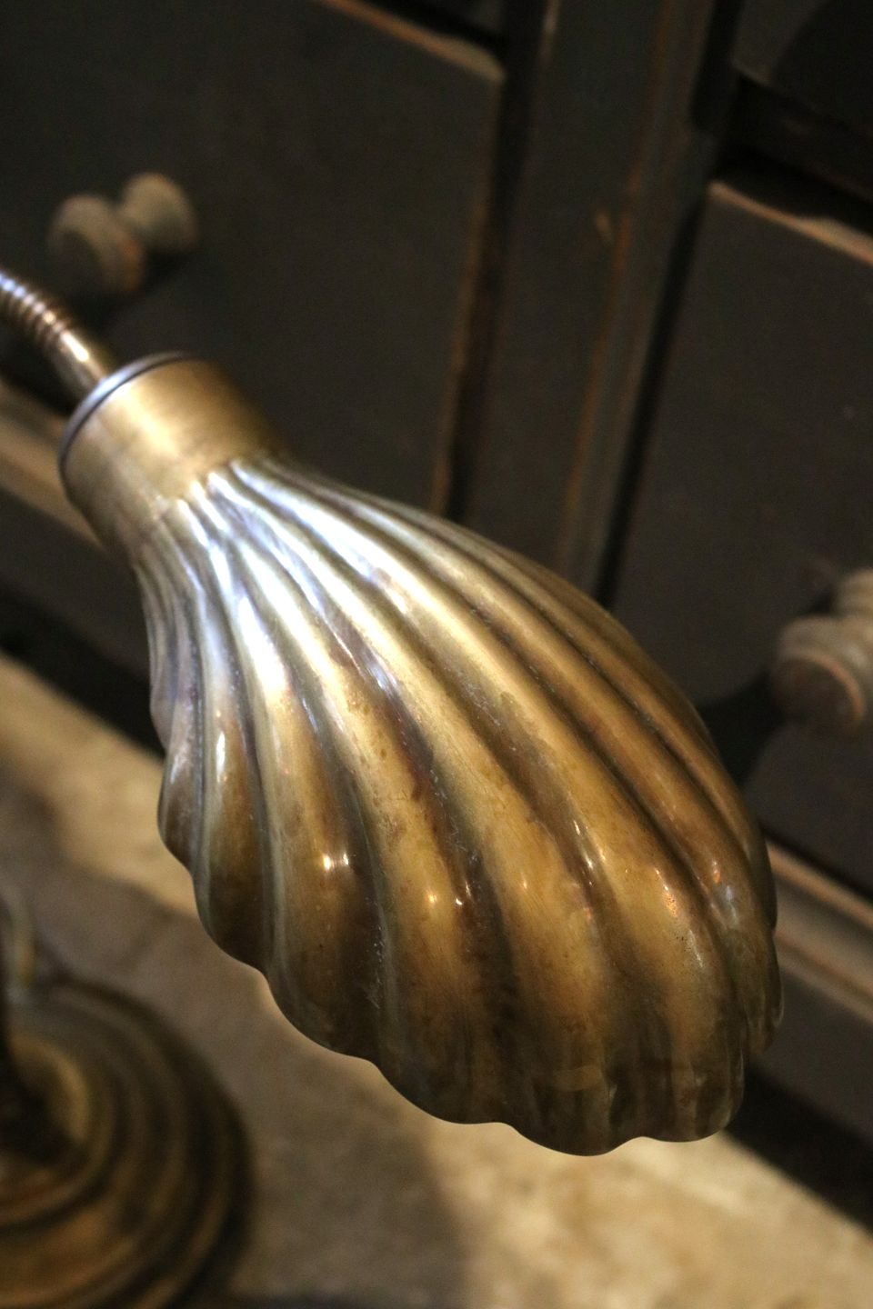 Gammel bordlampe i messing med musling formet skærm.