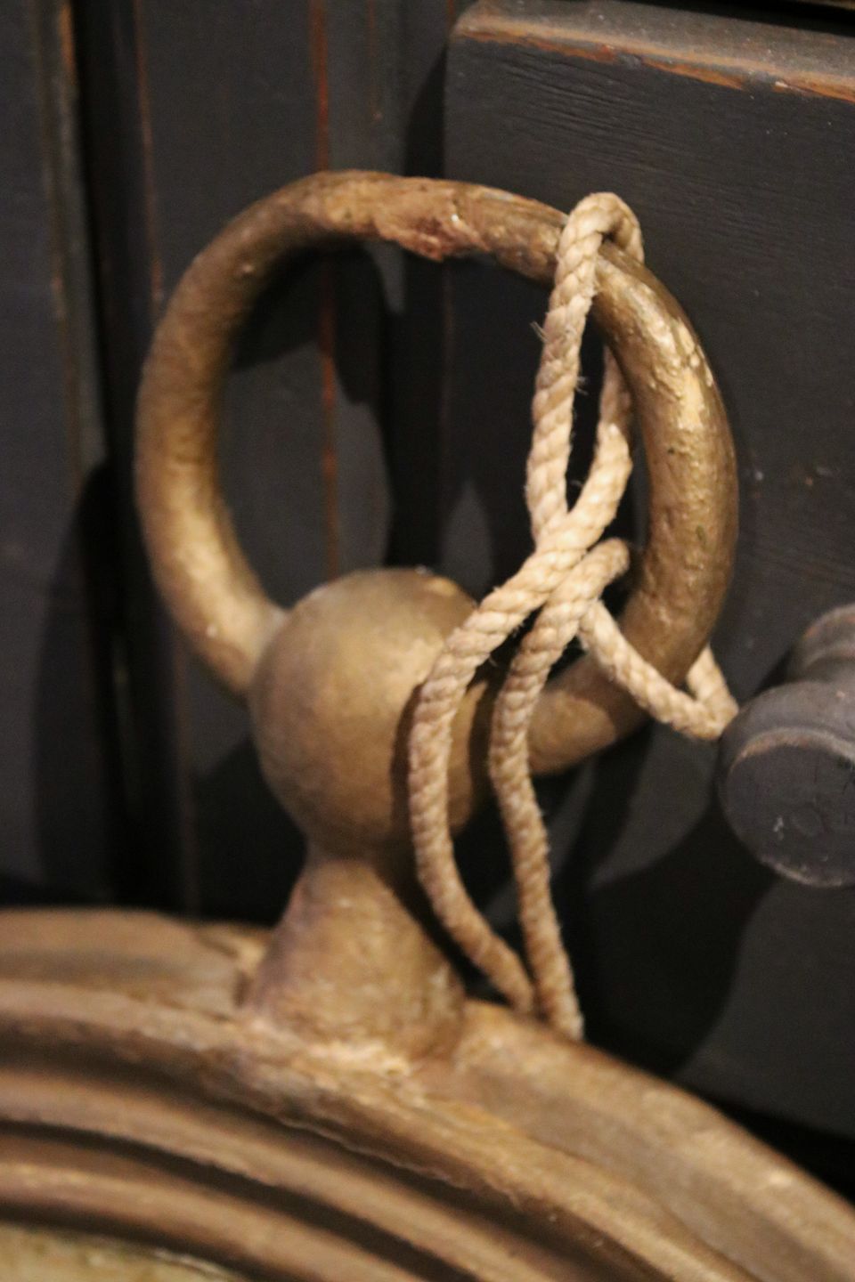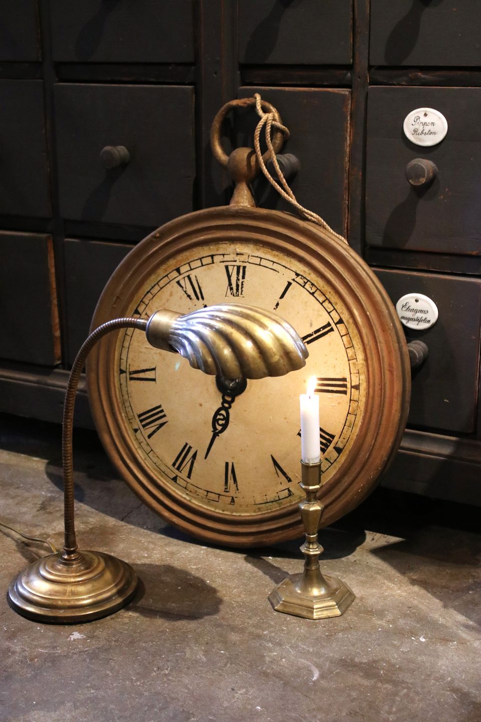 Dekorativt gammelt "ur" i træ fra urmager butik med gammel bemaling og med en rigtig fin patina. H: 68cm. Dia.: 47cm.