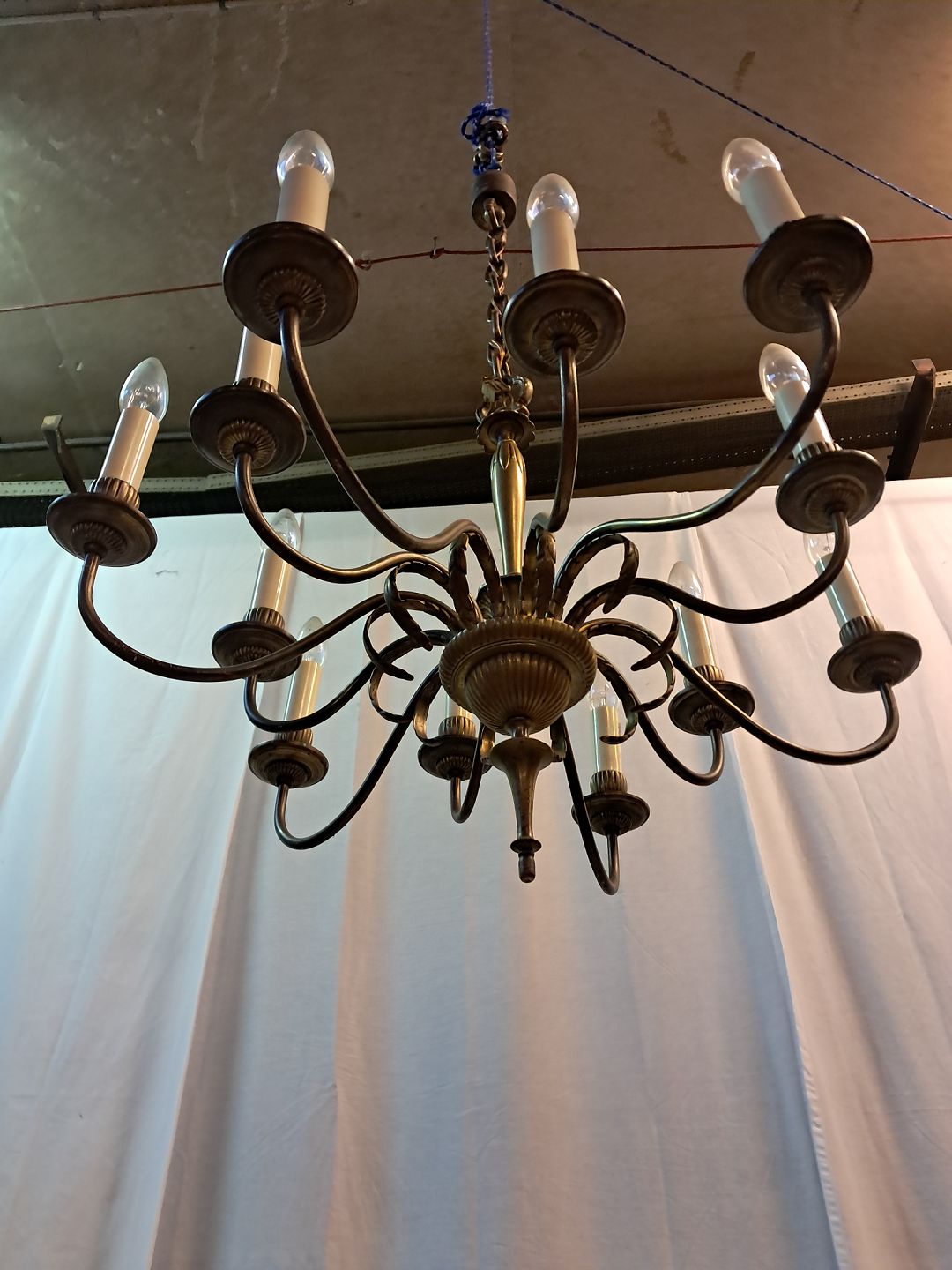 12-armet lysekrone i messing, fra 1950erne.