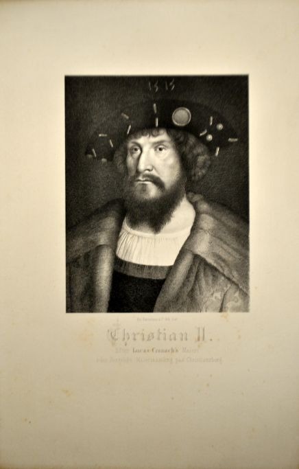 Bærentzen, Emil (1799 - 1868 ) Danmark: Portræt af kong Christian II. Efter Lucas Cranach's maleri i Den kongelige Malerisamling. Litografi. Tryk: 15,5 x 12 cm.