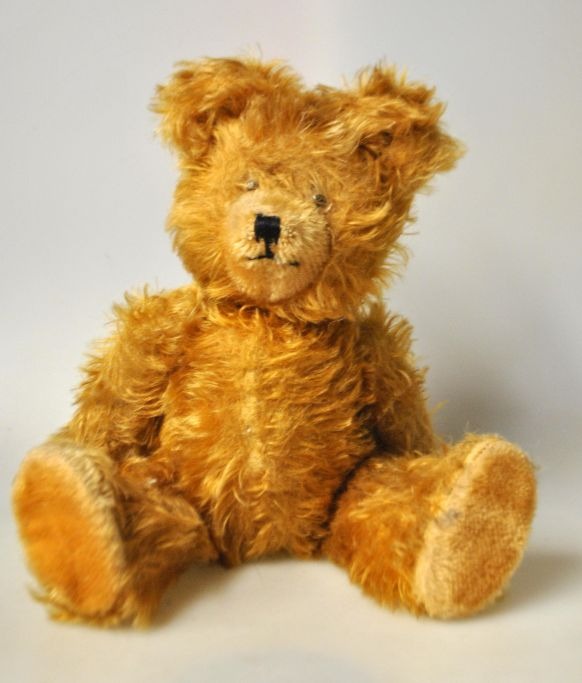 Gammel bamse, 20. årh. Gult lodden plyds. L: 30 cm.