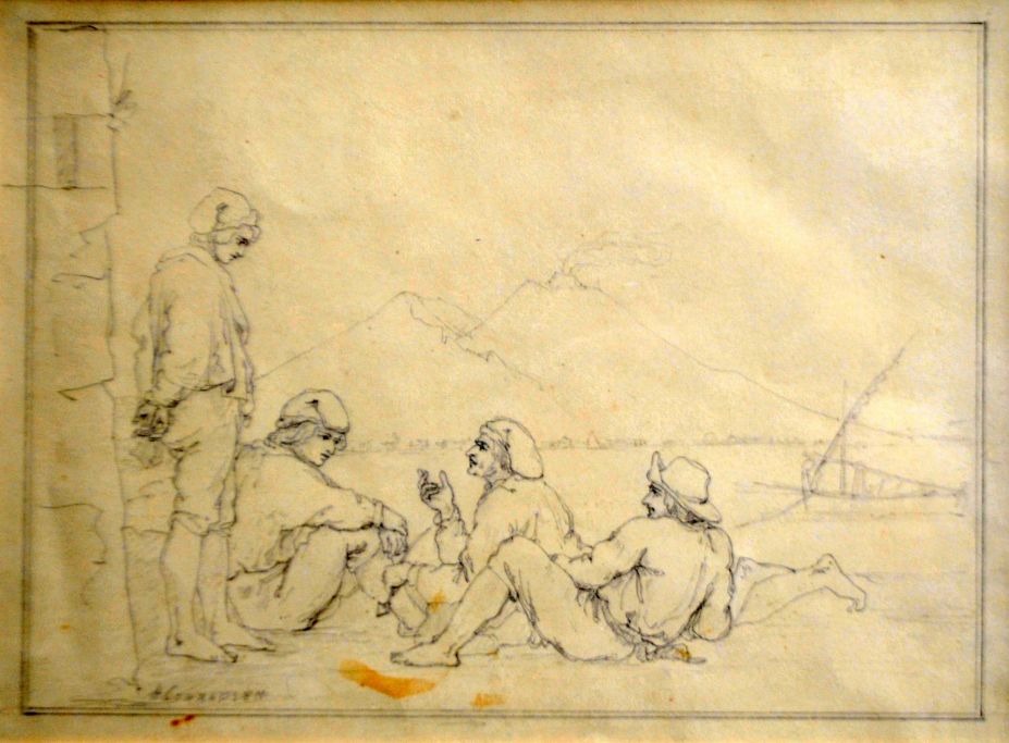 Conradsen, Harald (1817 - 1905) Danmark: Italienske fiskere i samtale på kajen, med Vesuv i baggrunden. Signeret 16 x 22,5 cm.