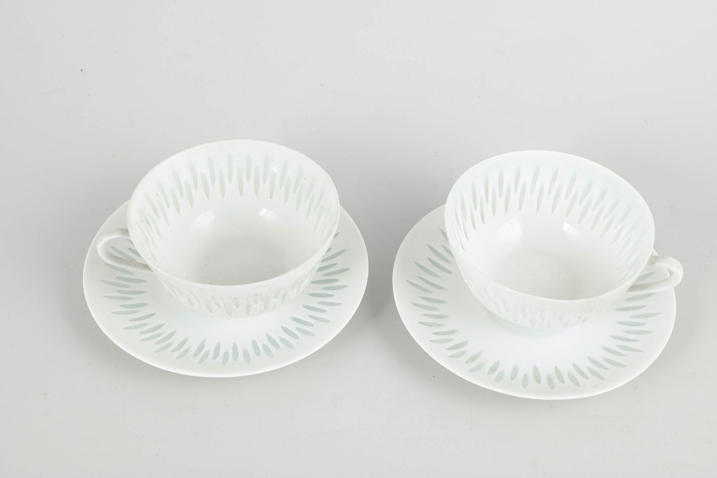 Sæt bestående af to tekopper med tilhørende underkopper i hvidt porcelæn med gennembrudt “rice porcelain”-dekoration. De aflange perforeringer udfyldt med transparent glasur skaber et let og næsten translucent udtryk, mens de enkle, afrundede former er karakteristiske for Friedl Holzer-Kjellbergs sene modernistiske porcelænsdesign for Arabia.