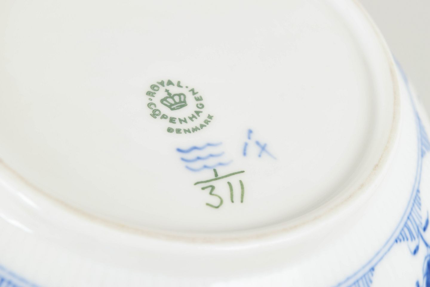 Musselmalet Riflet blev introduceret i 1775 og er Royal Copenhagens ældste og mest ikoniske stel. Dekorationen er inspireret af kinesisk blå-hvid porcelæn og kendetegnes af sin stringente opbygning, rytmiske penselføring og fine håndmalede detaljer. Skåle i denne størrelse blev anvendt til servering af både kolde og varme retter og afspejler fabrikkens høje håndværksmæssige niveau i midten af det 20. århundrede.