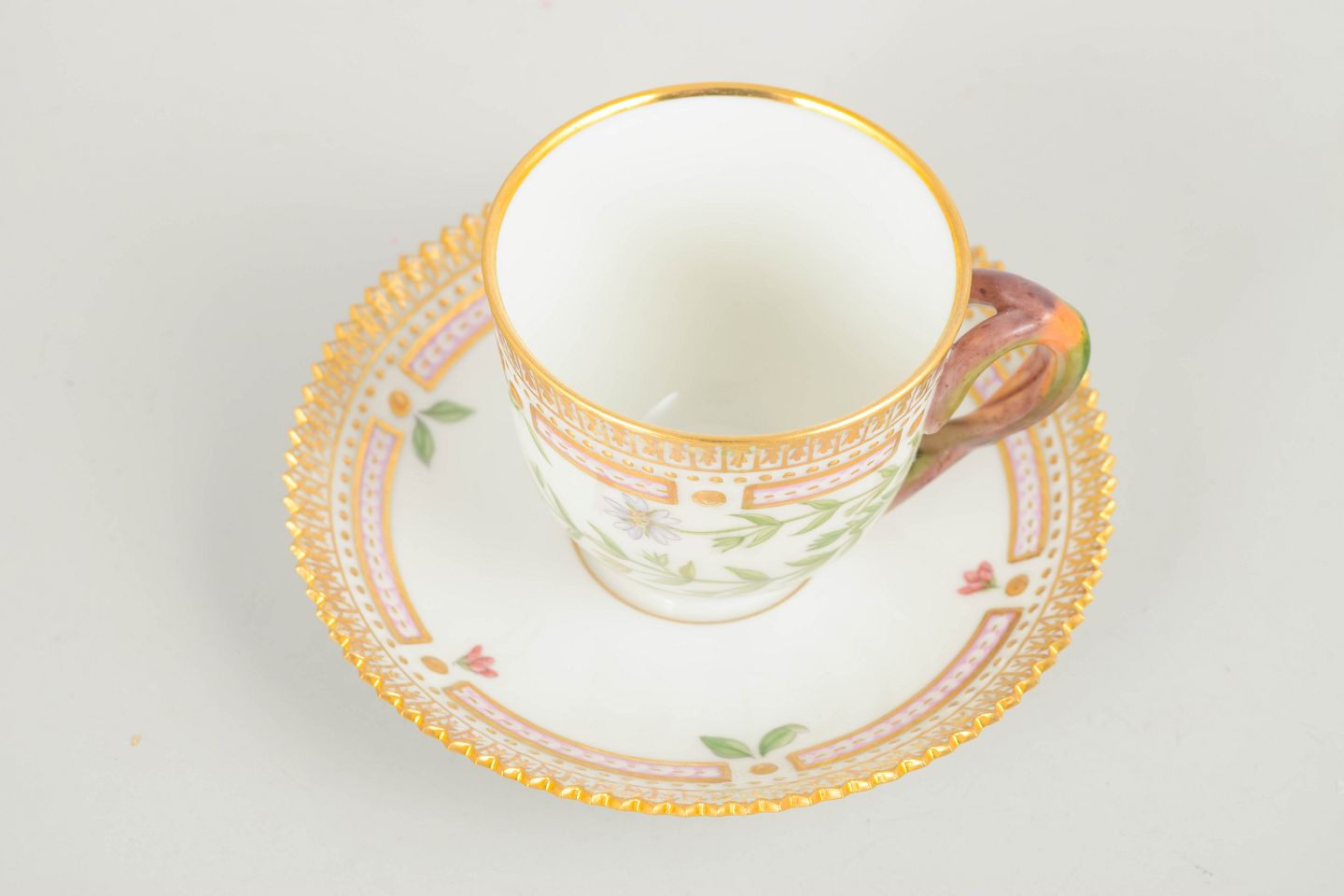 Elegant demitasse cup with matching saucer from the iconic Flora Danica service. The cup is hand-painted with a botanical motif derived from the Flora Danica publication and executed in the service’s characteristic refined form with a decorative rim. A classic and exclusive cup.