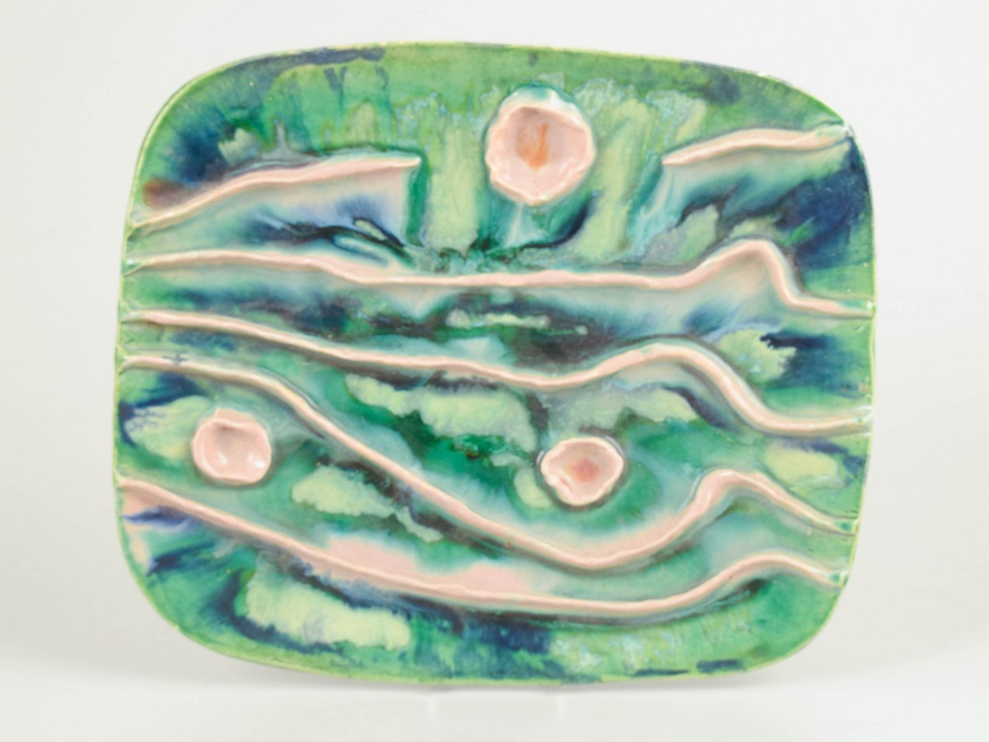 Unikt, væghængt keramisk relief udført i organiske former med markant reliefvirkning. Overfladen er rigt modelleret med bølgende linjer og forhøjede partier, dekoreret med levende glasurer i grønne og blå nuancer, kontrasteret af bløde, lyserøde reliefelementer. Et ekspressivt og sanseligt værk, der tydeligt afspejler 1970’ernes eksperimenterende keramiske udtryk.