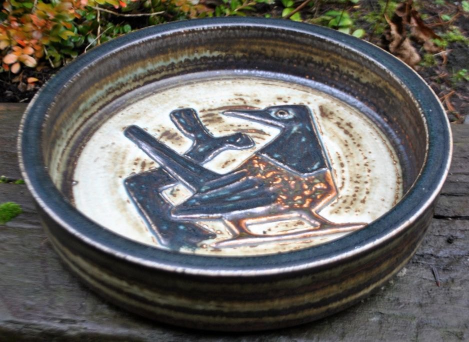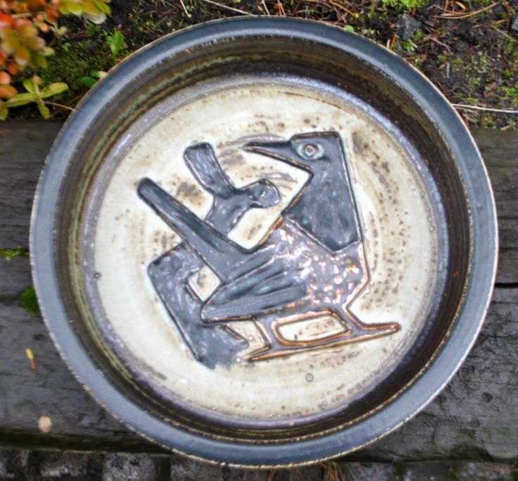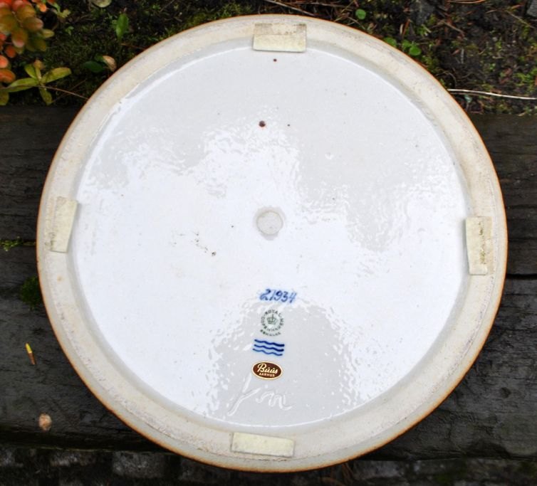 Mogensen, Jørgen (1927 - ) Danmark: Stort fad. 21.934. Dekoration i form af fugl og en gren. Udført i stentøj for Royal Copenhagen. Med sung glasur. Dia.: 31,5 cm. H.: 7 cm.