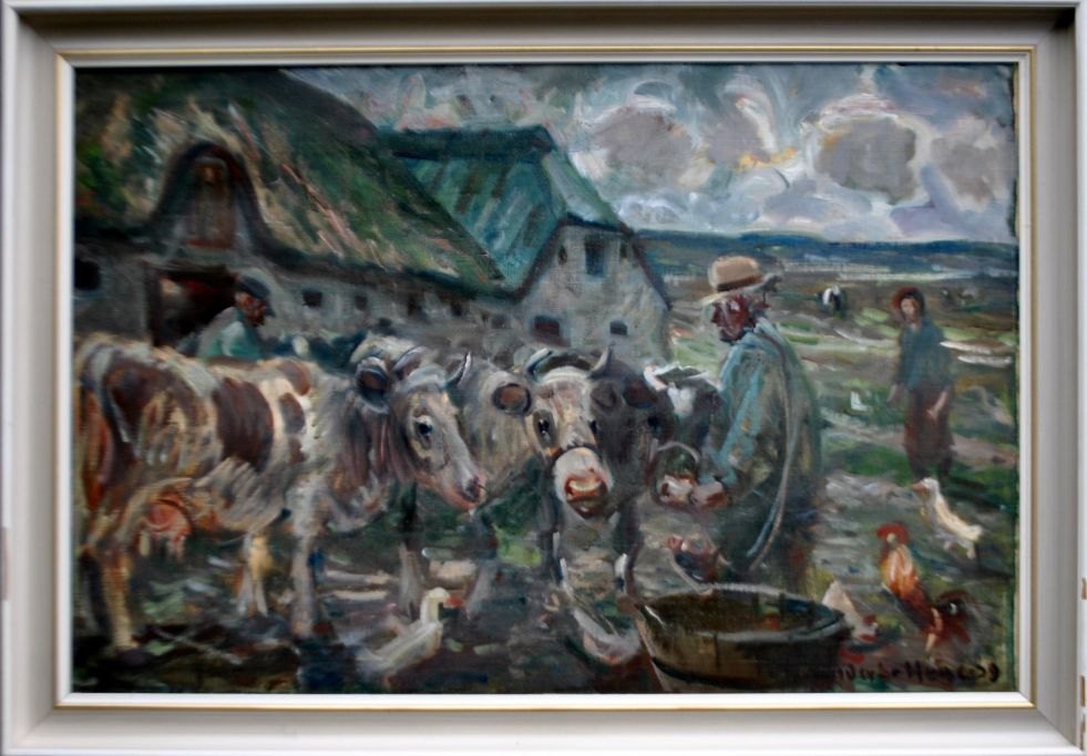 Hune, Anders (1894 - 1968) Danmark: Kreaturerne fodres, 1939. Olie på lærred. Signeret: Anders Hune 39. H: 65 cm. B: 100 cm.