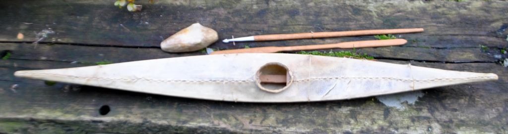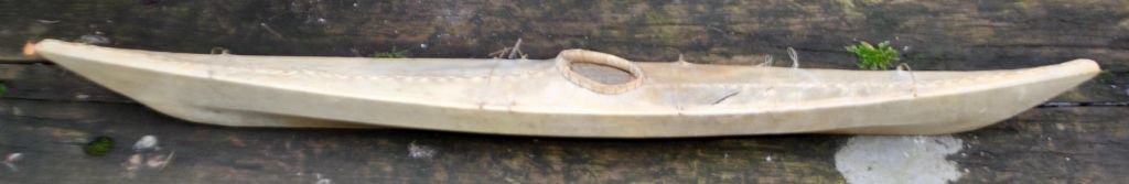 Stor Grønlandsk kajak, 20. årh. Sælskind over træskelet. Medfølgende åre, spyd og blære. L.: 70 cm.