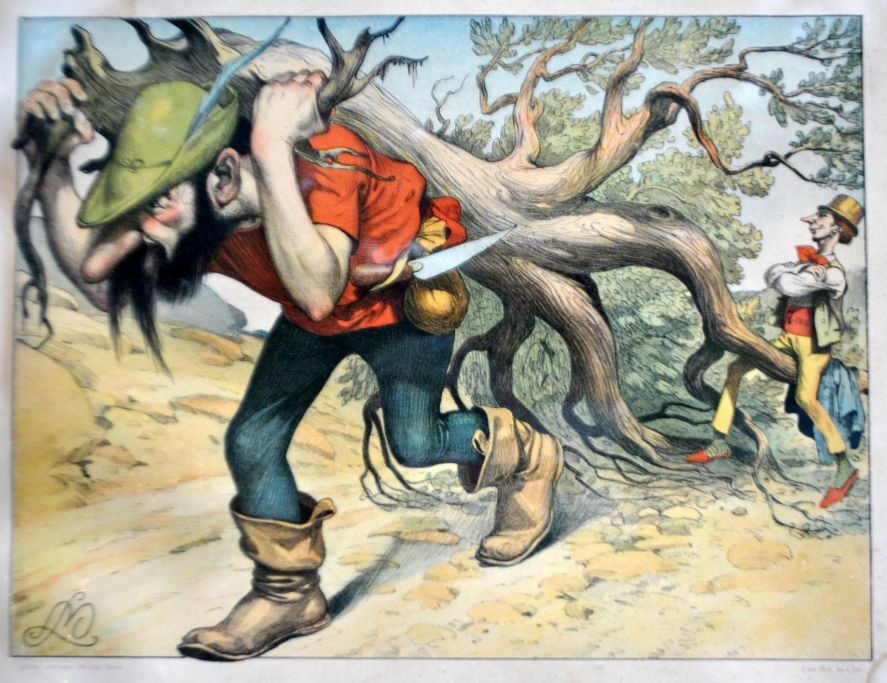 Moe, Louis (1877 - 1945) Danmark: Kompostion med mand, der bærer et træ. Farvelitografi. Signeret i trykket. Udgivet af Alfred Jacobsen, København. 27,5 x 36 cm.