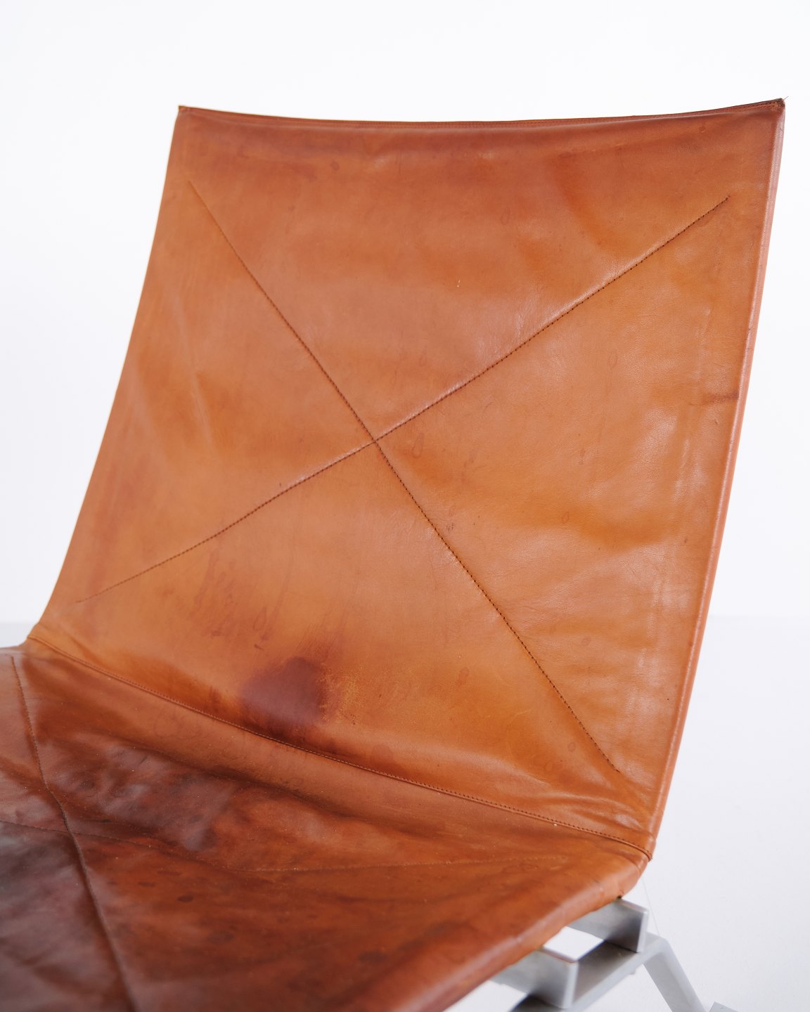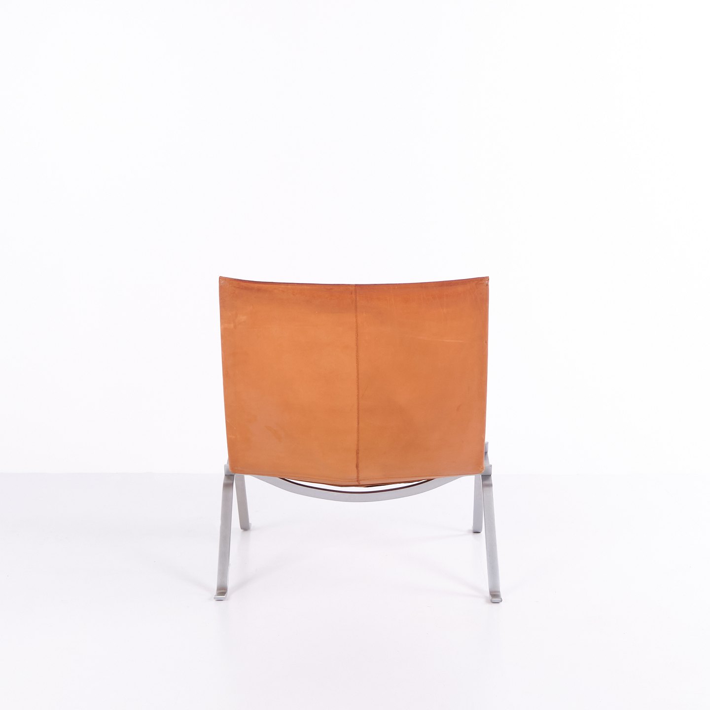 PK22 lænestol af Poul Kjærholm for E. Kold Christensen. Original polstring i patineret cognac læder. Dansk designikon fra 1950’erne.
