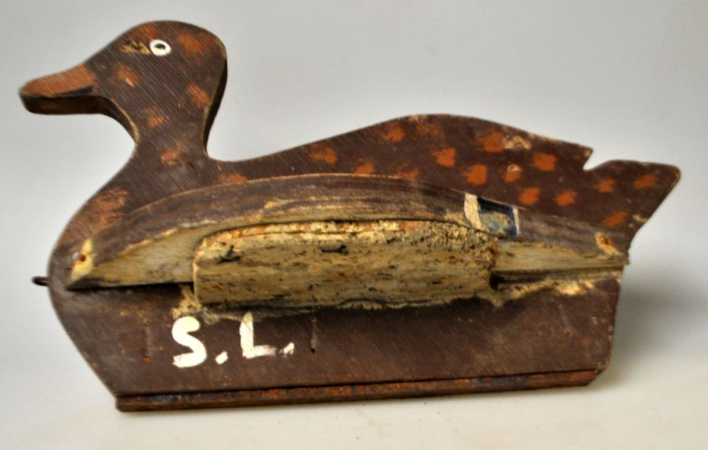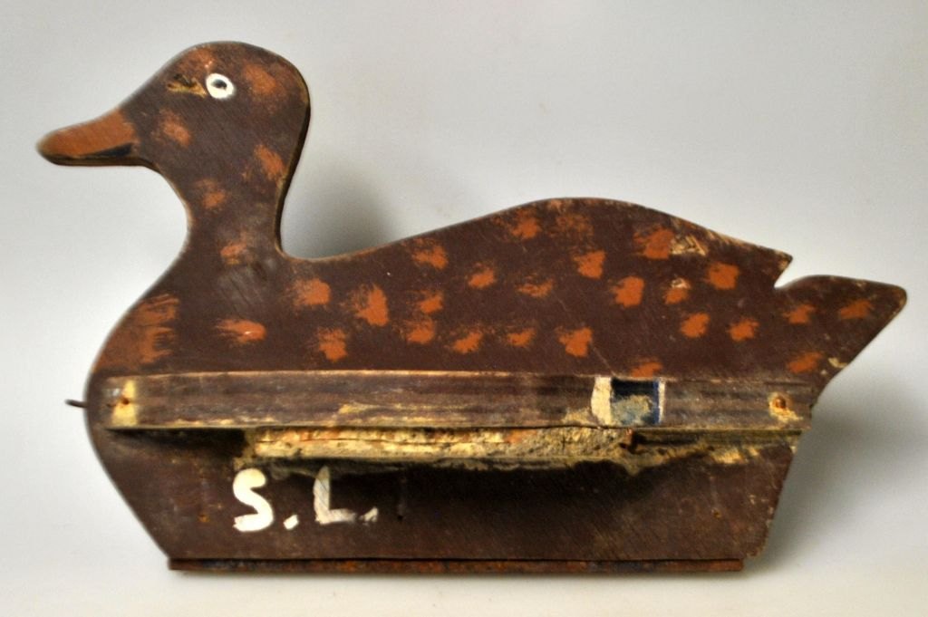 Lokkeand i bemalet fyrretræ, ca. 1920. Danmark. Brunbemalet med hvidt og blåt. Balance med jern og bly. Ejermærke: S.L: L.: 29 cm. H: 16 cm.