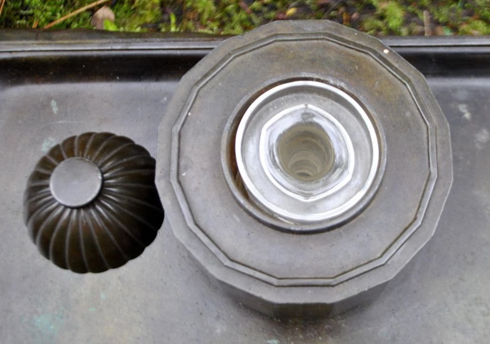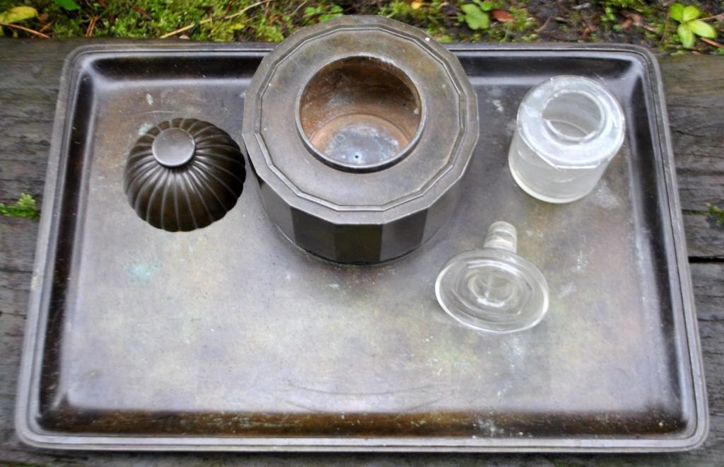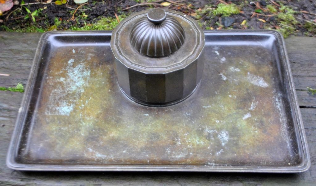 Plade med blækhus i art deco stil. I blækhuset er der et bæger til blæk med låg (defekt).