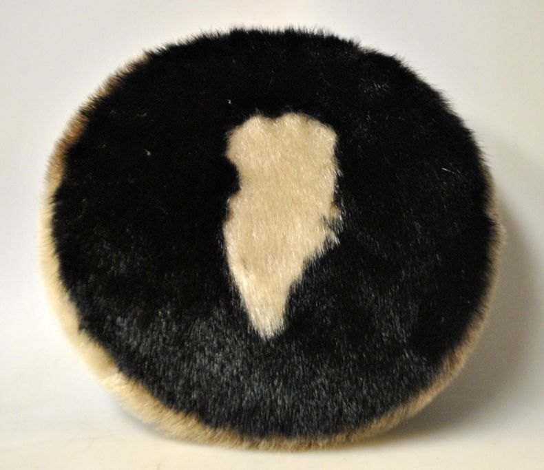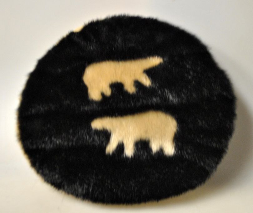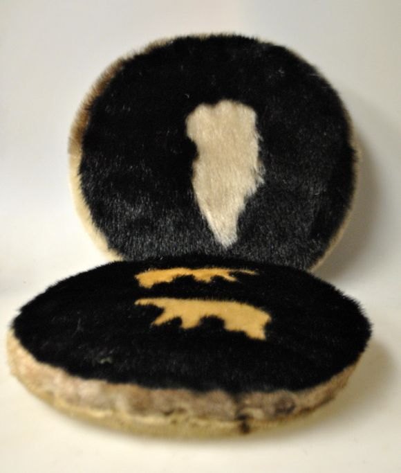 To puder i sælskind, Grønland, 20. årh. Den ene pude dekoreret på begge sider med Grønlands omrids. Den anden pude dekoreret med to isbjørne på den ene side og lys pels på den anden. Dia: 27 cm.