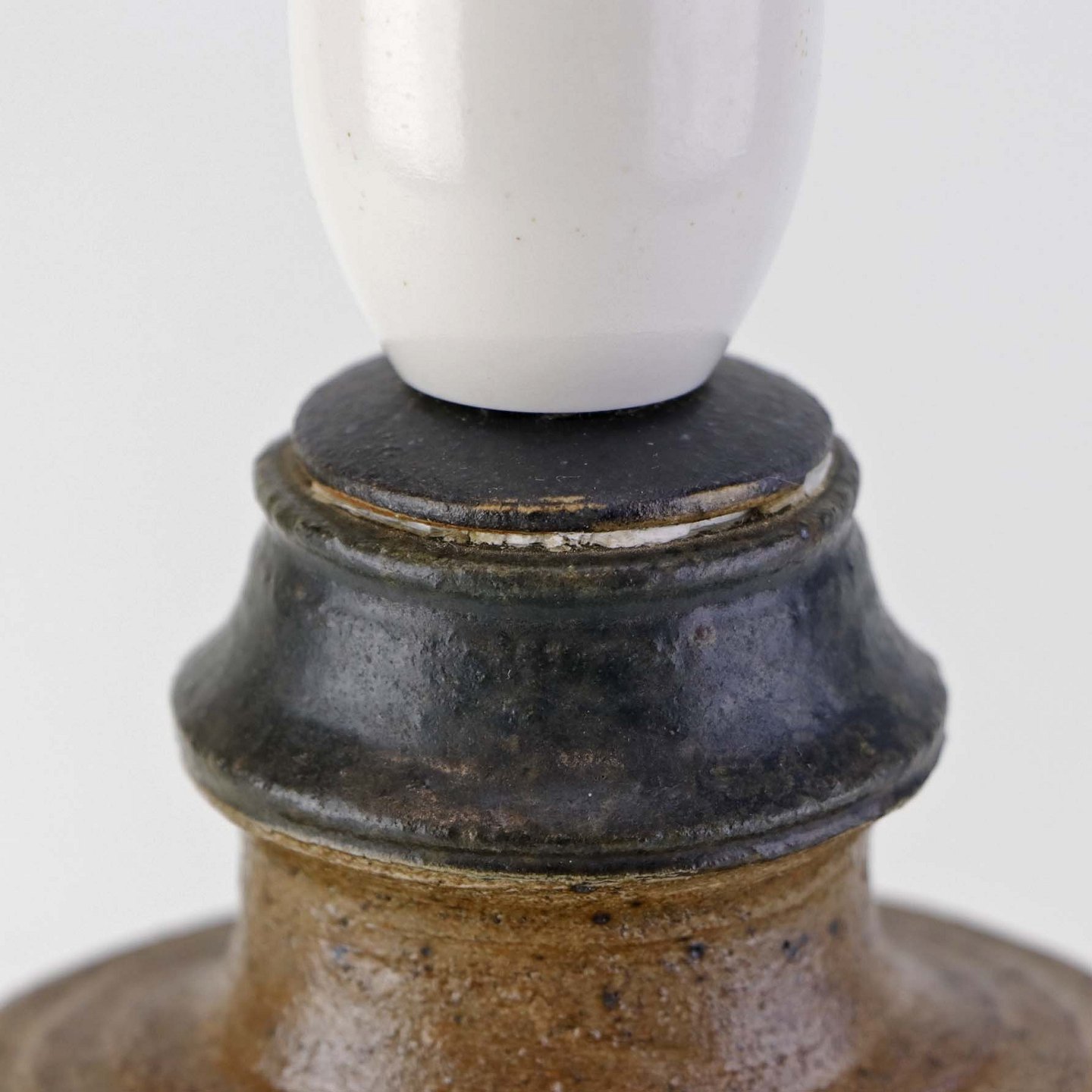 Oval lampefod i keramik med brun og blåsort glasering og lys plastfatning.