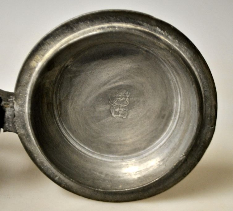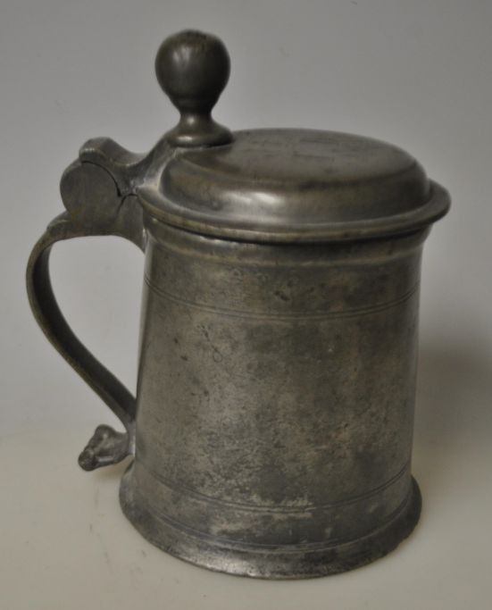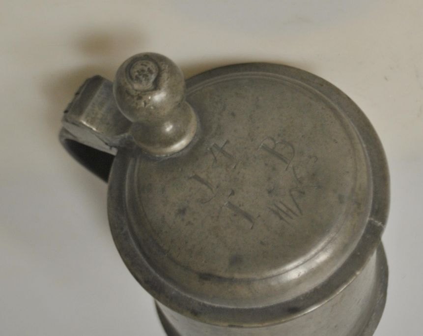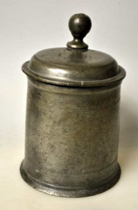 Tinkrus 1763, Tyskland. Konisk med hank og gæk. Stemplet i låg. H.: 16 cm. På låg indgraveringer.
