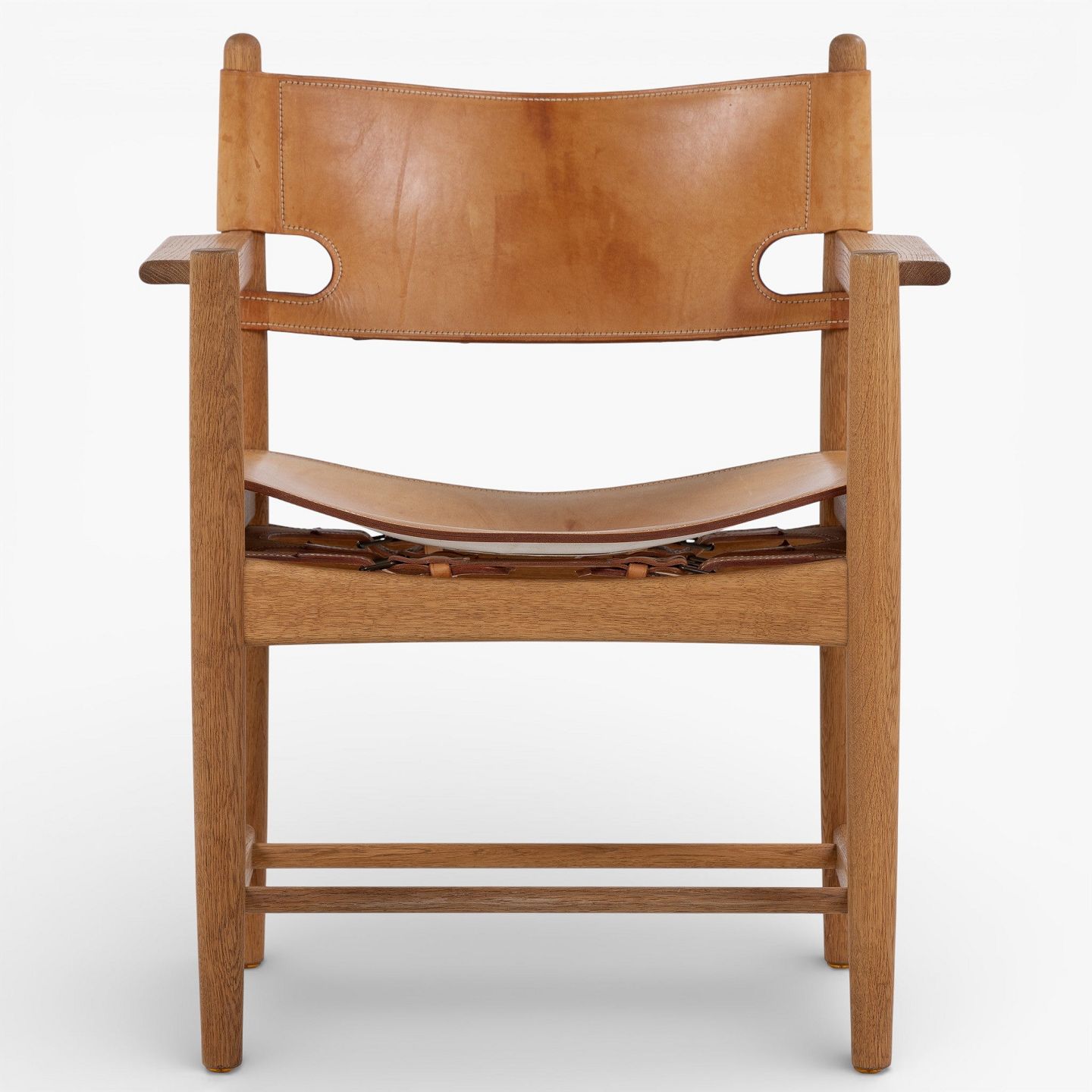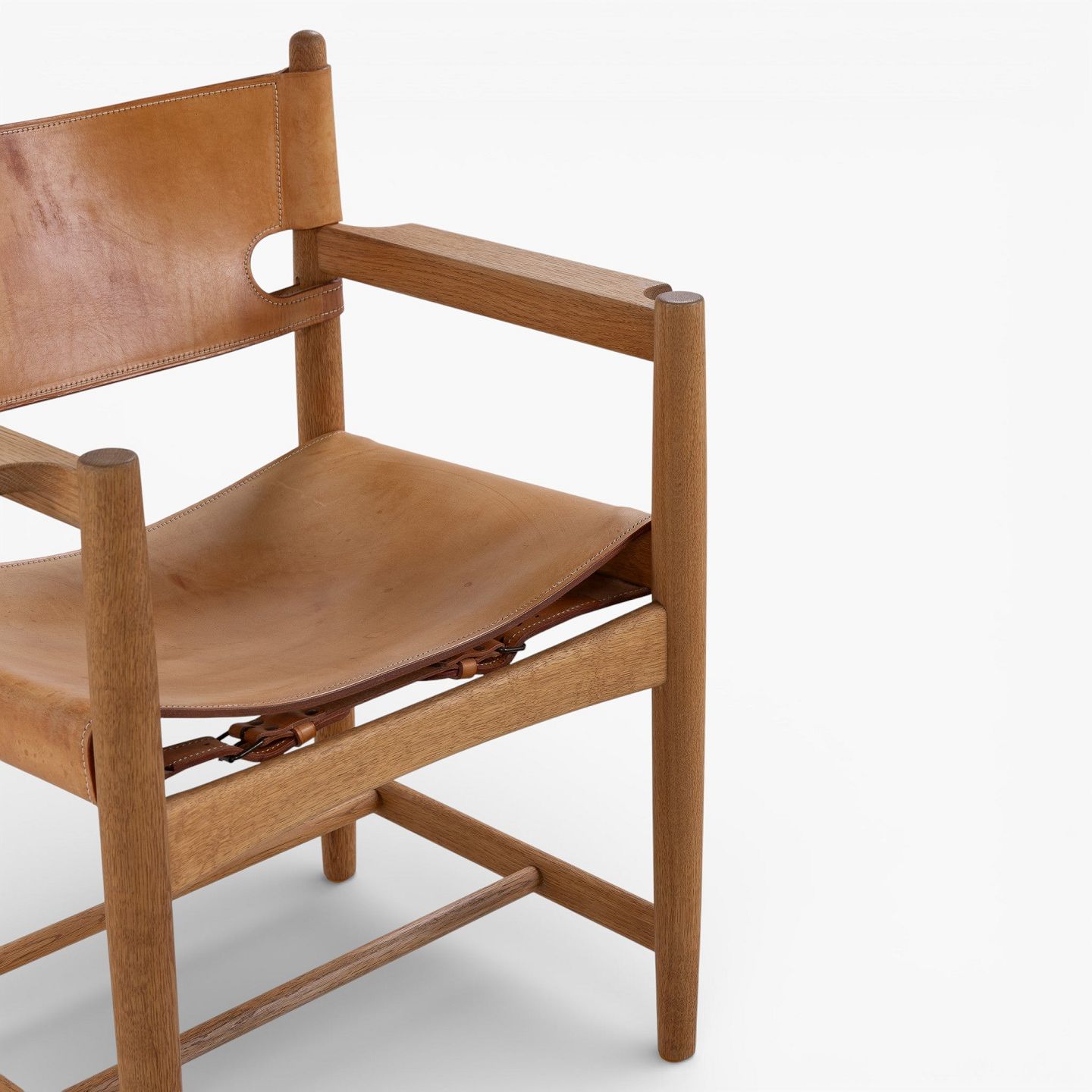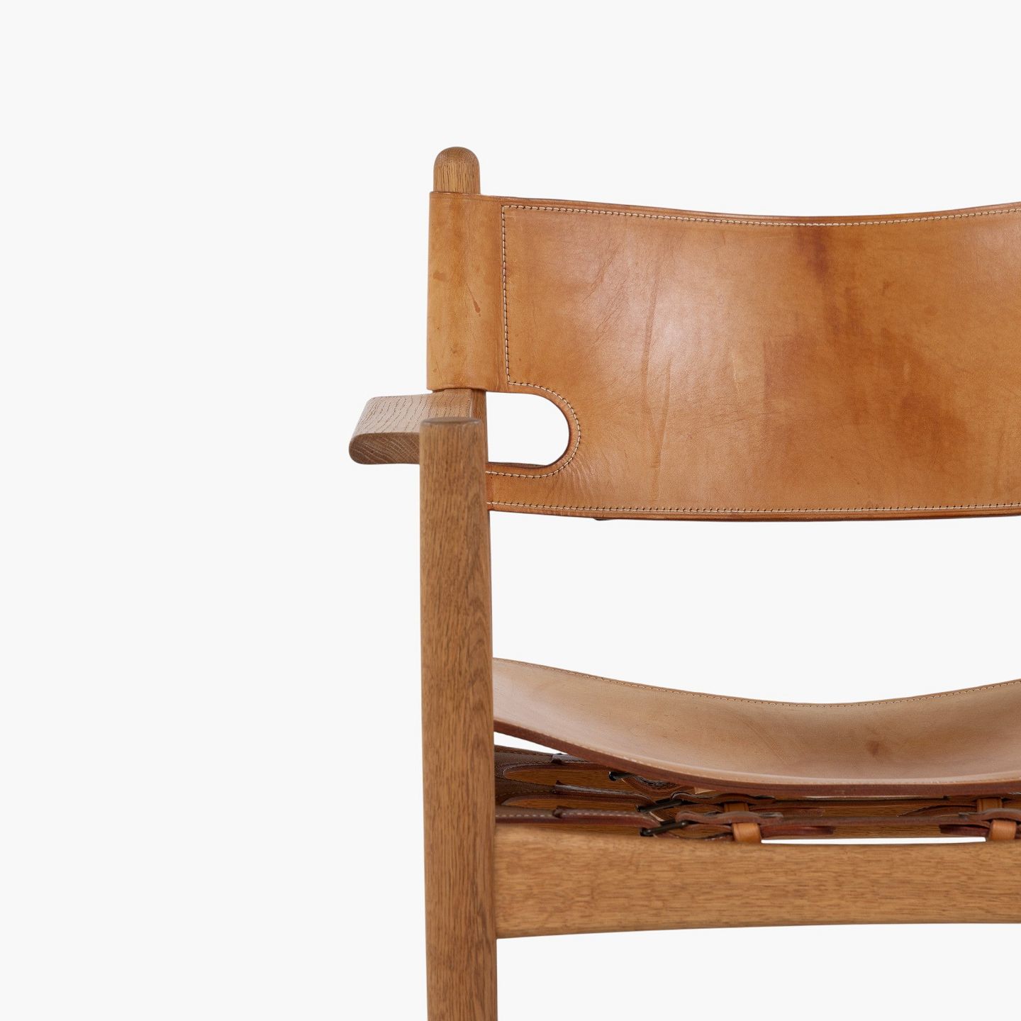BM 3238 - 'Jagtstol' i patineret egetræ og kernelæder m. armlæn. Mærket fra producent.