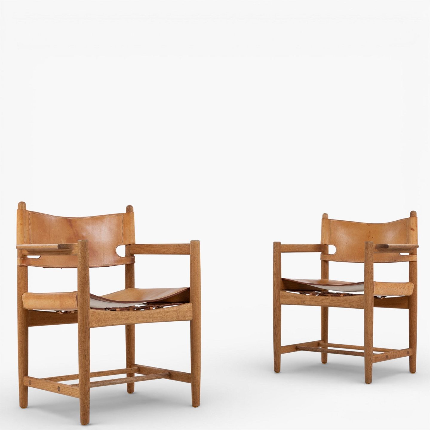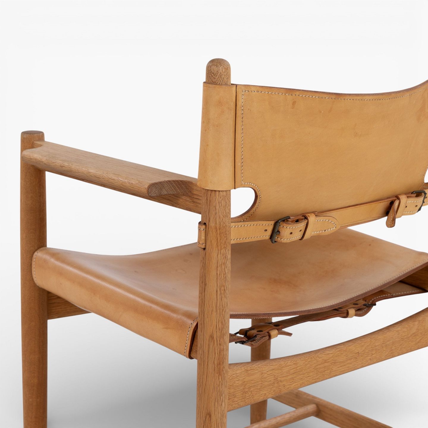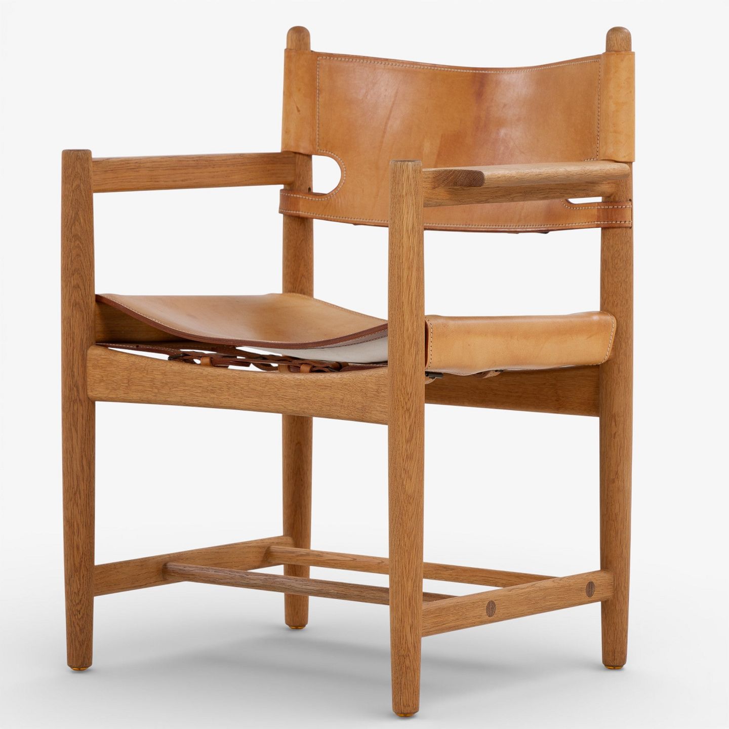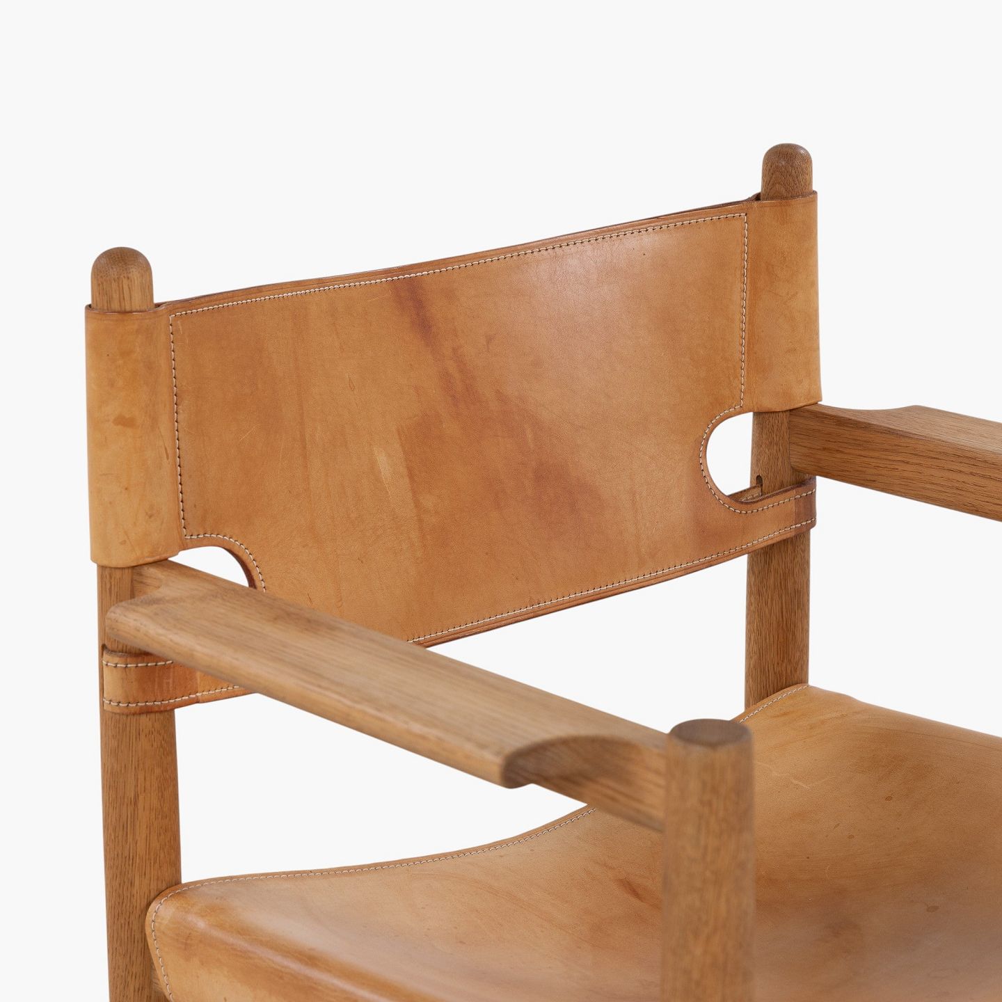 BM 3238 - 'Jagtstol' i patineret egetræ og kernelæder m. armlæn. Mærket fra producent.