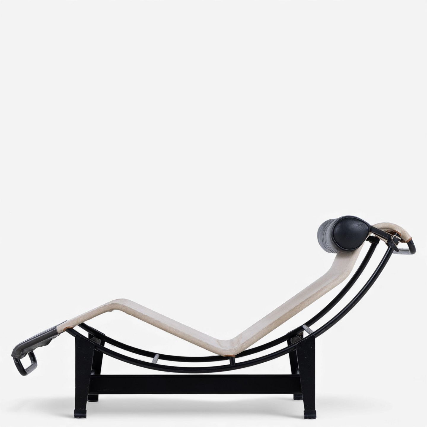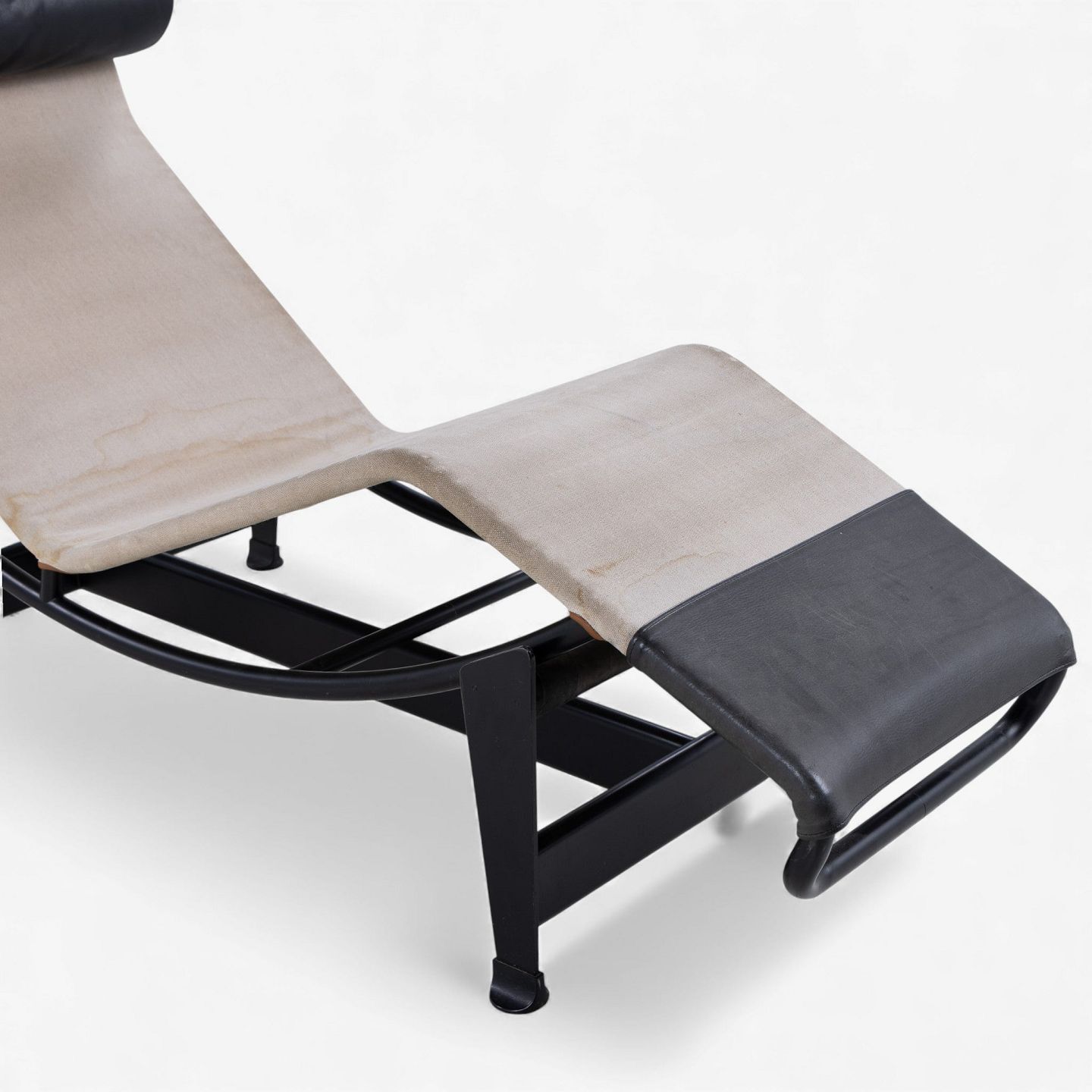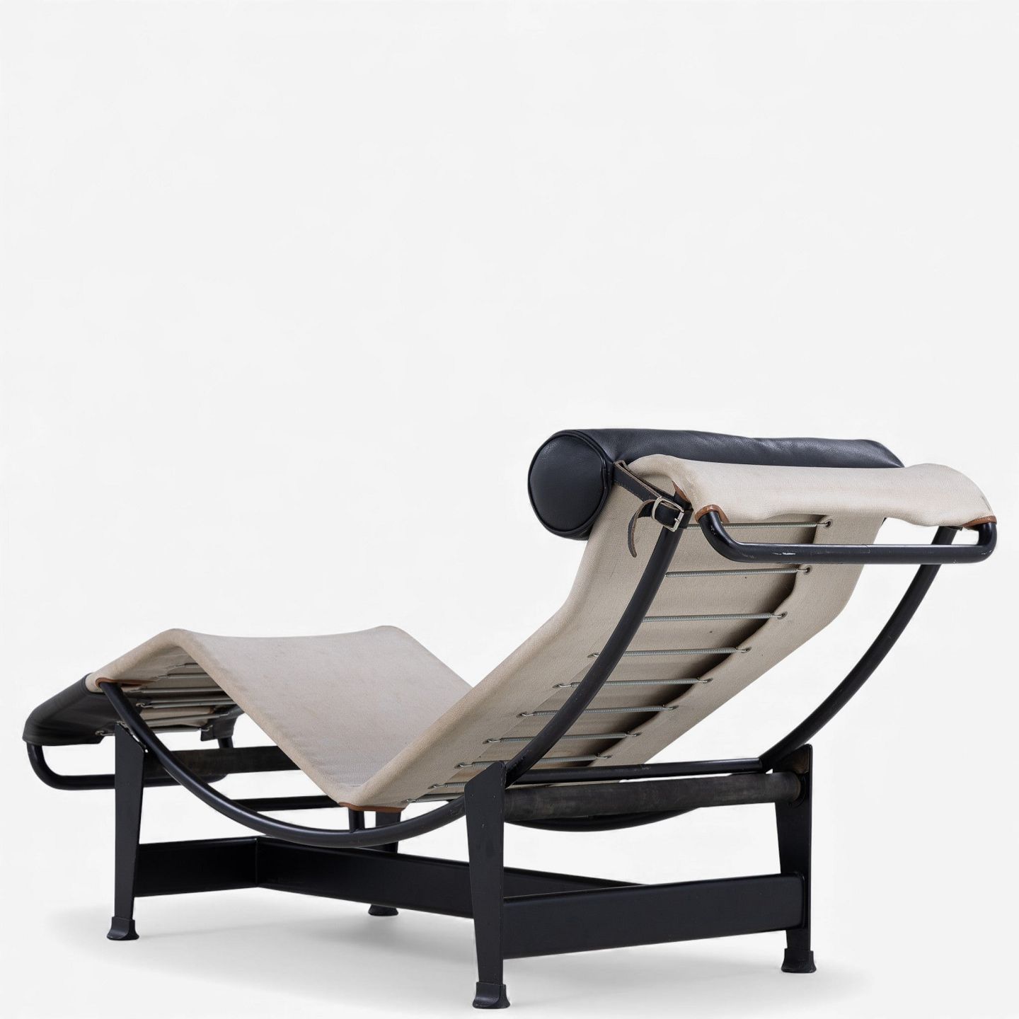 LC 4 - Chaiselong i patineret naturkanvas og sort læder på stel i sortlakeret stål. Formgivet i 1928.