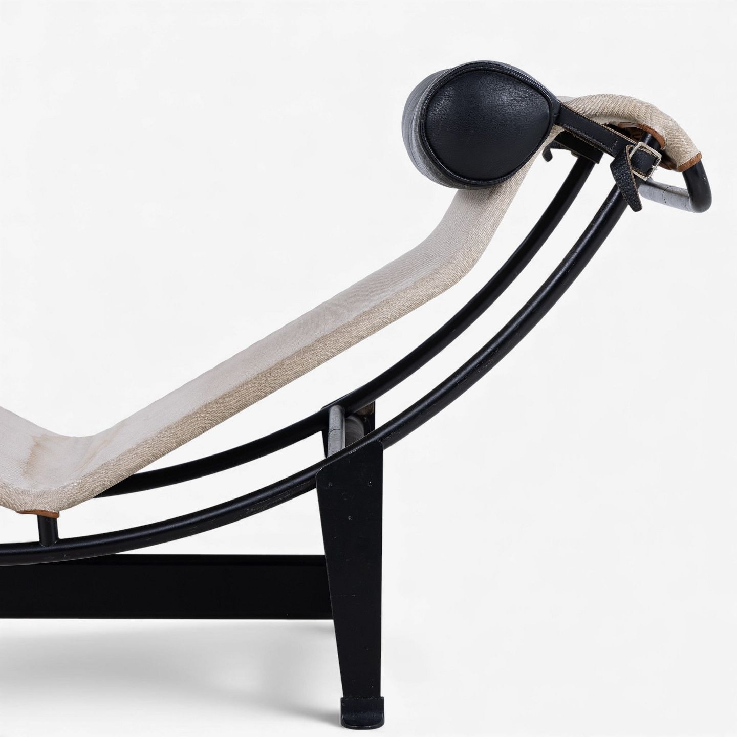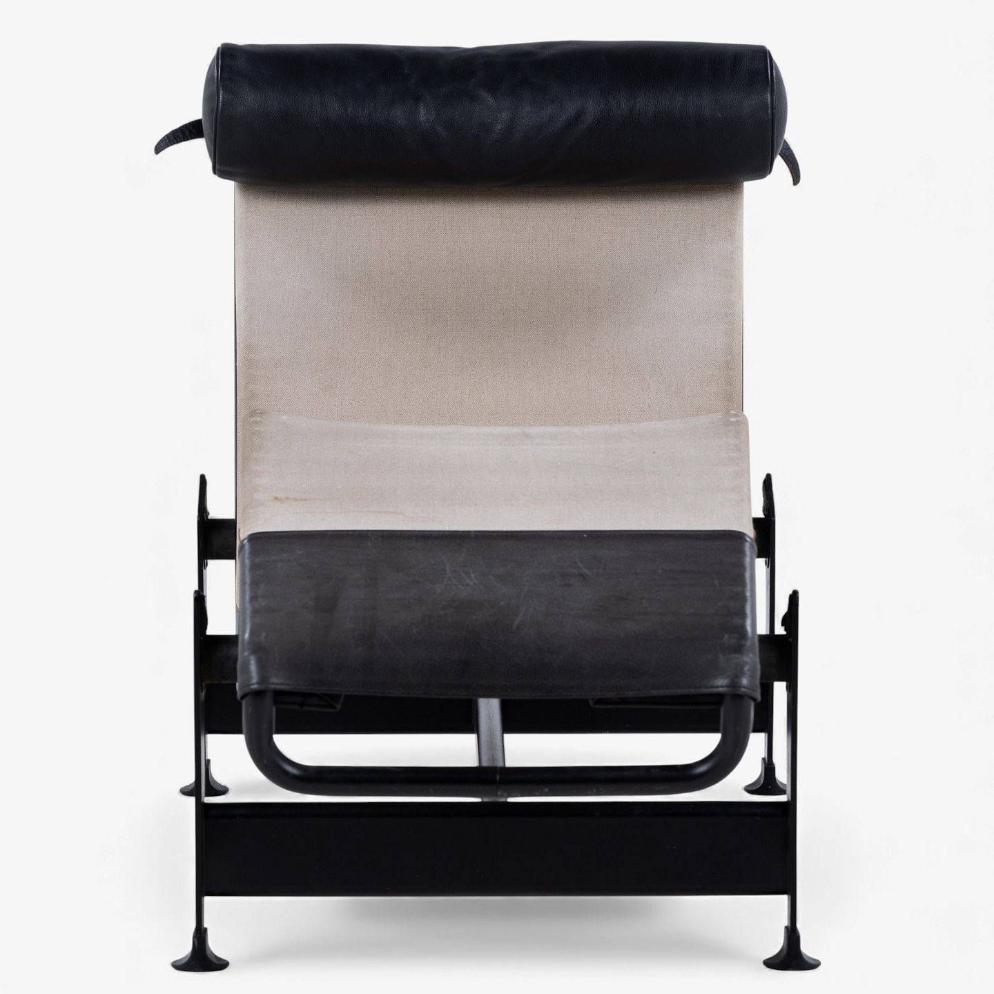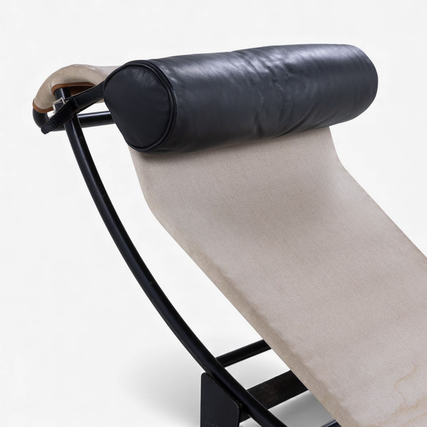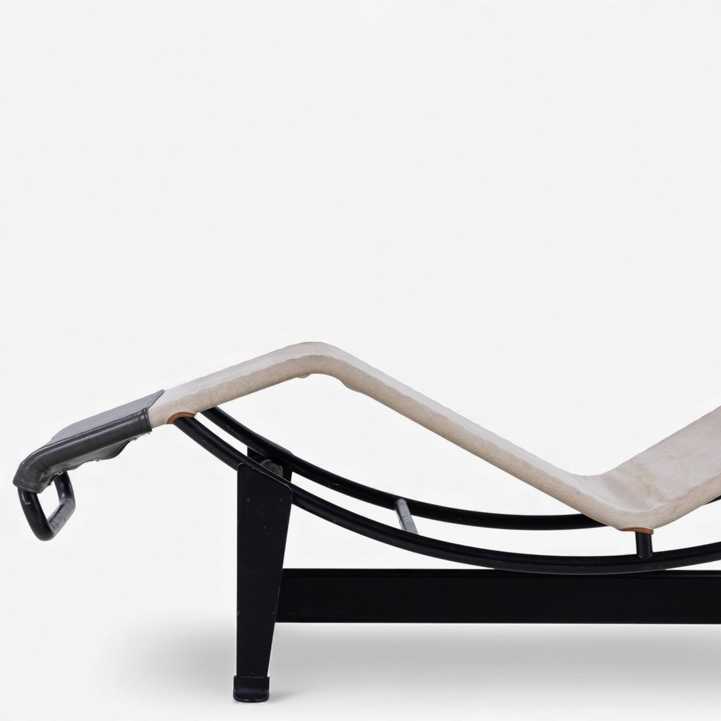LC 4 - Chaiselong i patineret naturkanvas og sort læder på stel i sortlakeret stål. Formgivet i 1928.
