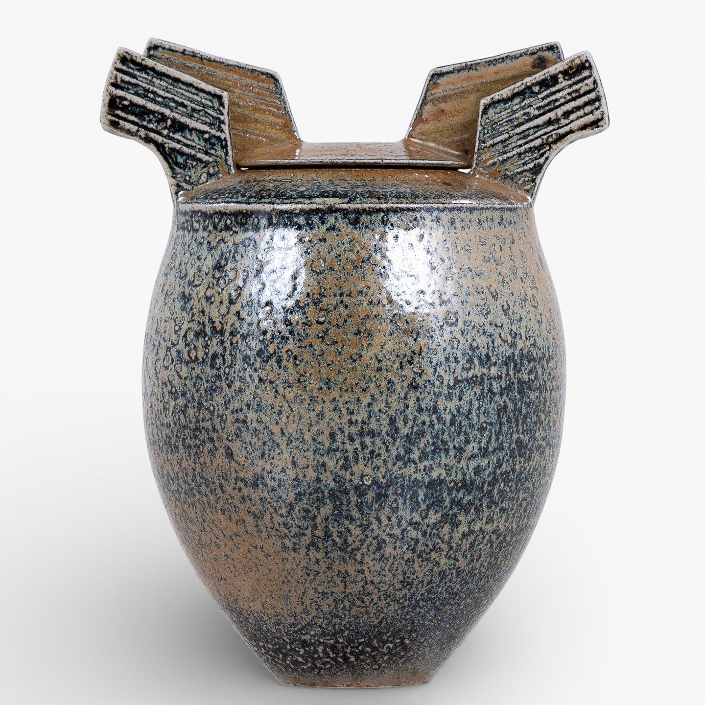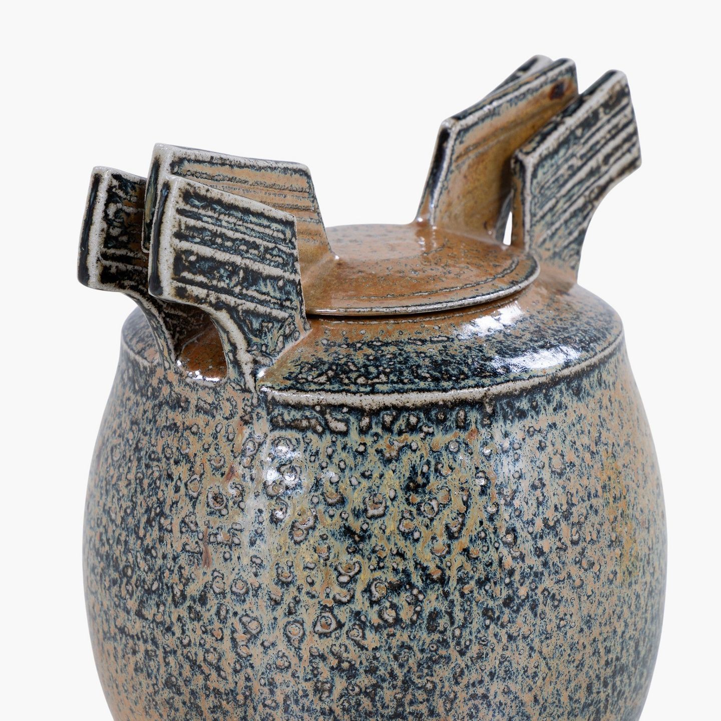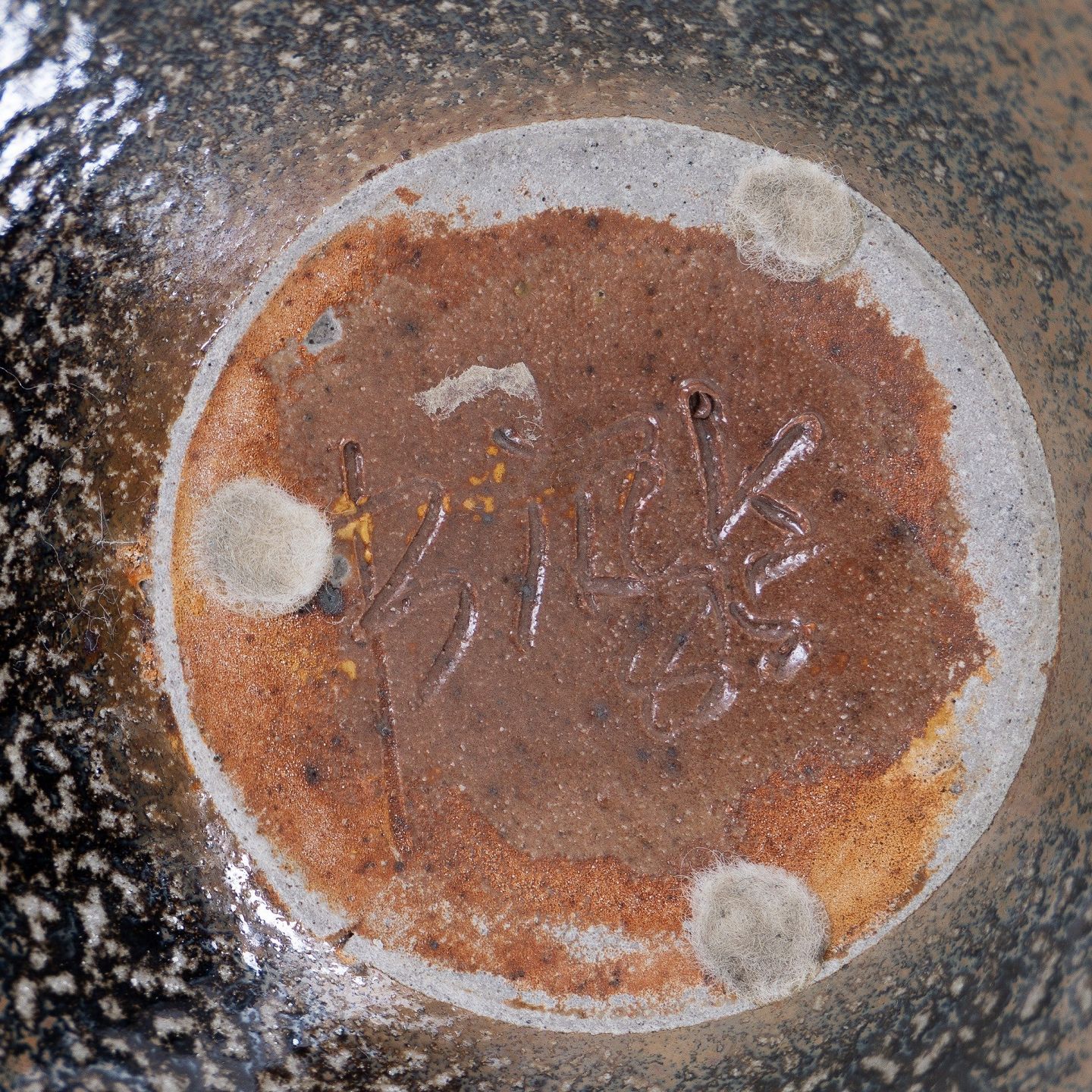 Unik lågkrukke i stentøj med brun saltglasur. Signeret 'Birck 85'.