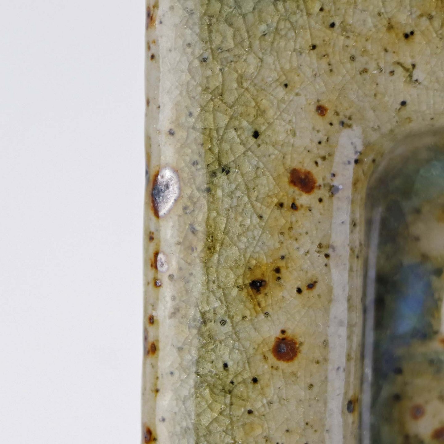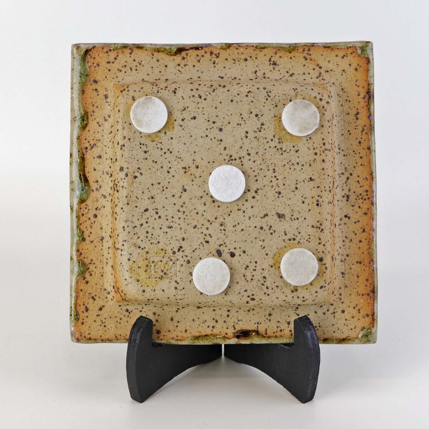 Firkantet fad i keramik med struktureret bund med lyseblå og beige glasur med røde pigmenter.