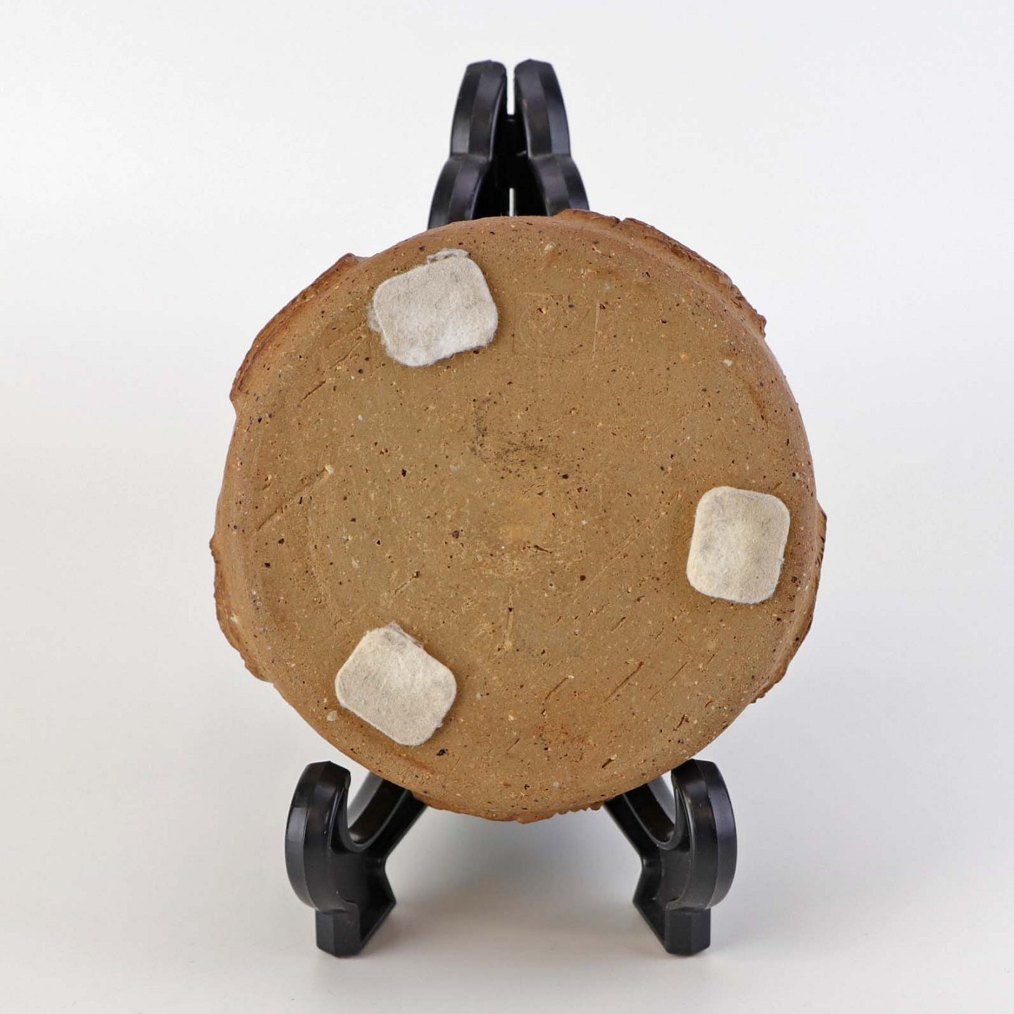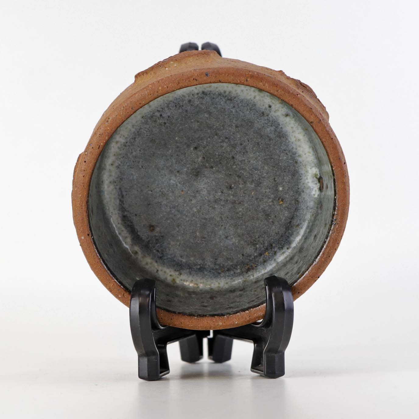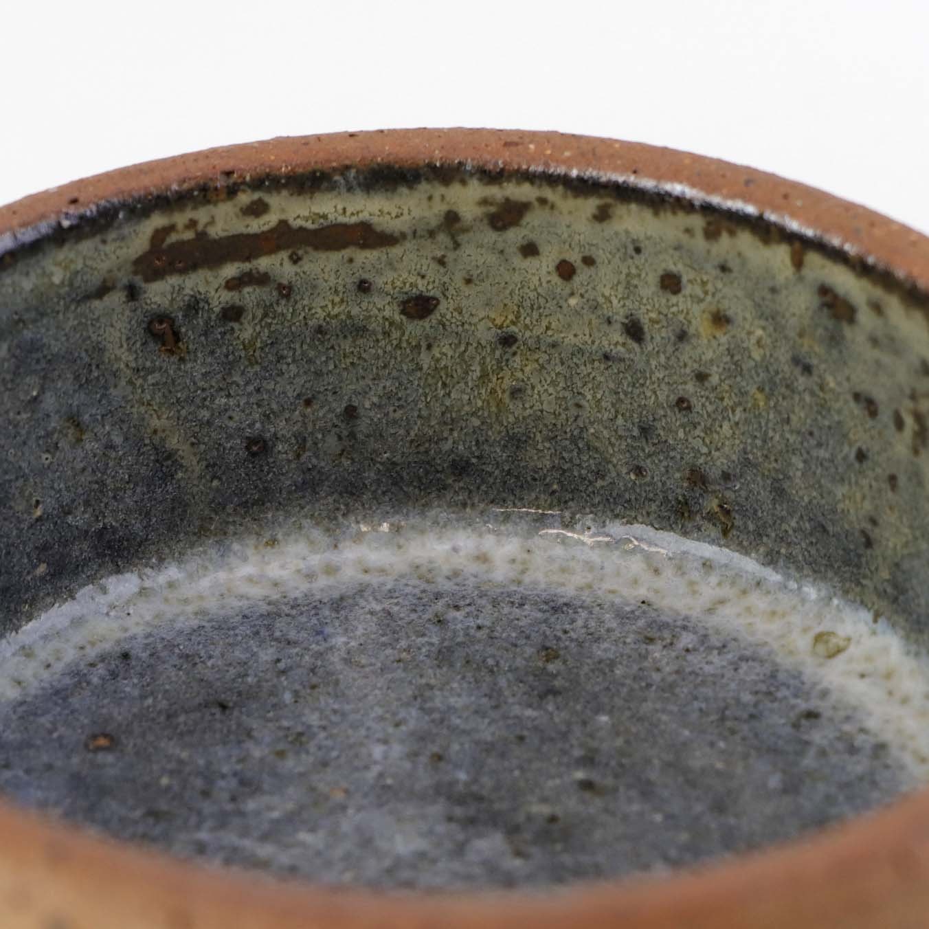 Lille rund skål i keramik med grå glasur på indersiden samt abstrakt mønstret yderside i uglaseret keramik.