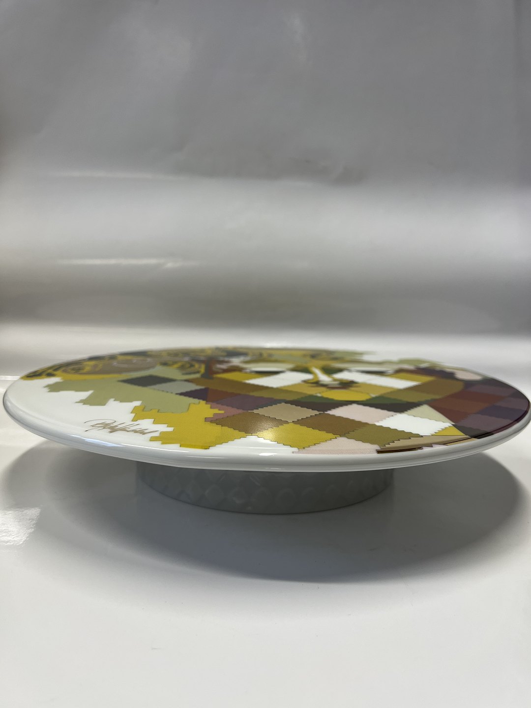 Dette smukke og tidløse kagefad, er et must have til det moderne køkken. Et smukt minimalistisk kagefad i ensartet hvid, med flot motiv på toppen. Motivet er en smuk mosaik af farver og figurer, der tilsammen giver det - for Bjørn Wiienblad - så karakteristiske ansigt med de smukke øjne. Foden er lavet med smukt rude-mønster, der giver fadet liv.
