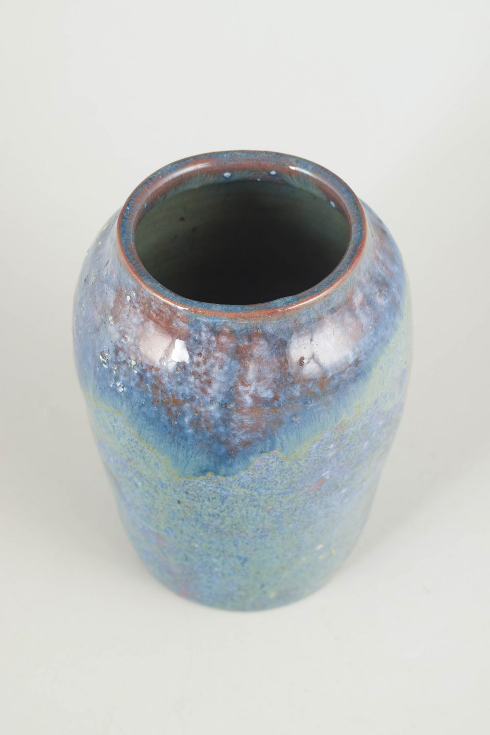 Elegant og balanceret vase udført i stentøj med blank, flerlaget glasur i blålige og grønlige nuancer med mørkere overgange ved halsen. Overfladen har et levende og dybdevirkende udtryk, karakteristisk for tidens eksperimenterende glasurteknikker.