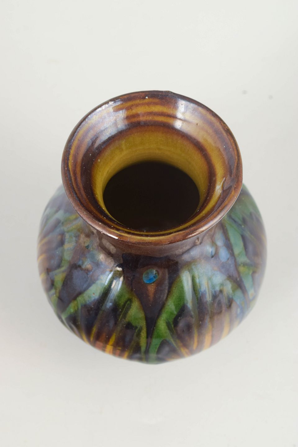 Kählers stentøjsproduktion i 1930’erne er kendt for sine eksperimenterende glasurteknikker og dekorative overflader. Oksehornsteknikken gav mulighed for at styre glasurens bevægelse direkte i materialet og resulterede i dynamiske, næsten flammende mønstre. Mindre vaser som denne forener teknisk kunnen med et stærkt visuelt udtryk og er karakteristiske for periodens keramiske formsprog.
