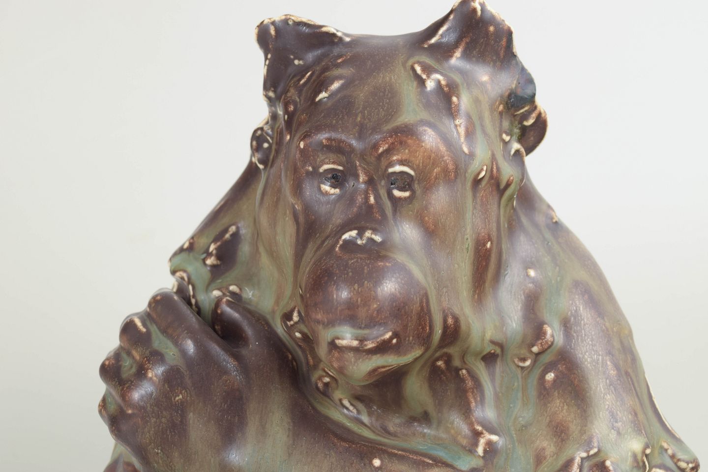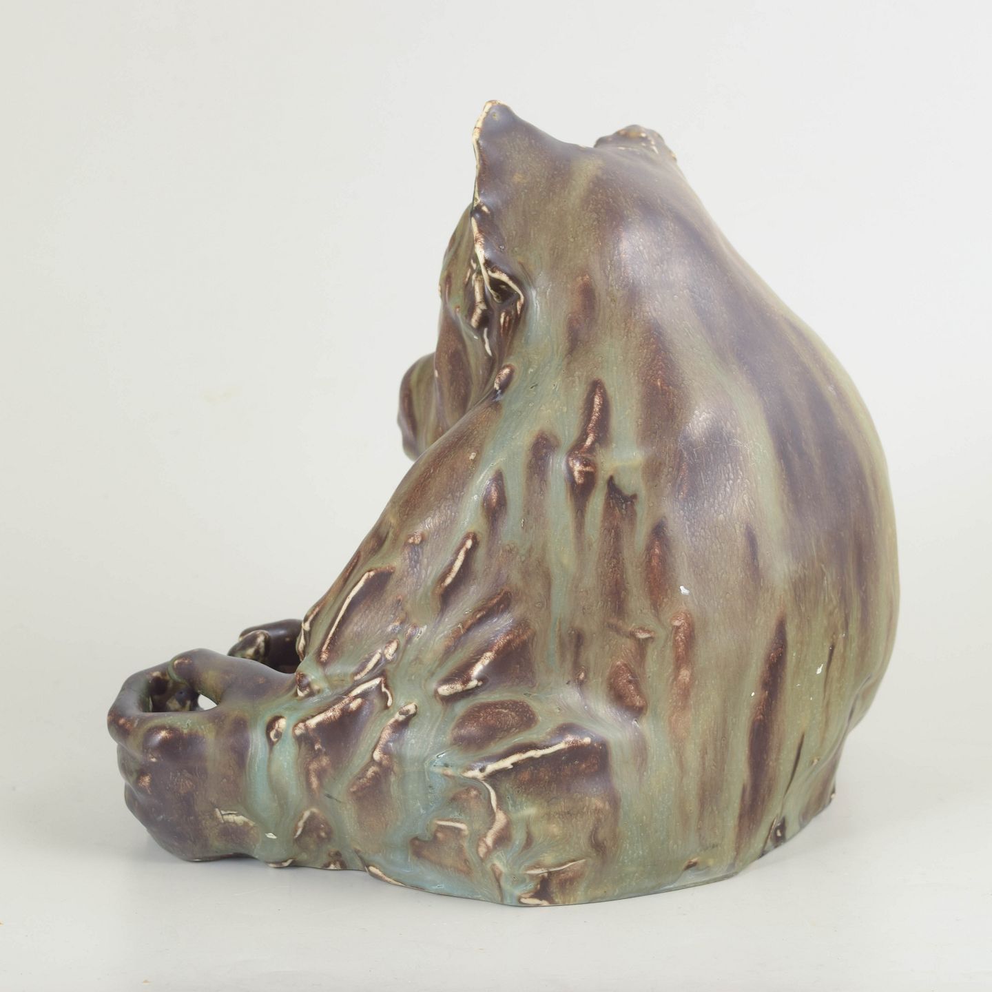 Figurativ stentøjsskulptur modelleret som siddende chimpanse med kraftfuld, plastisk form og levende overflade i nuancerede, løbende glasurer. Et karakteristisk og sjældent værk fra Jean René Gauguins dyreskulpturer for Bing & Grøndahl.