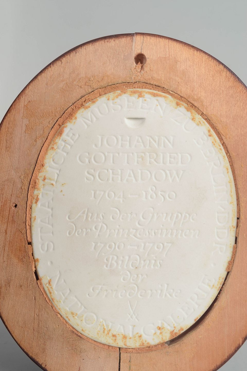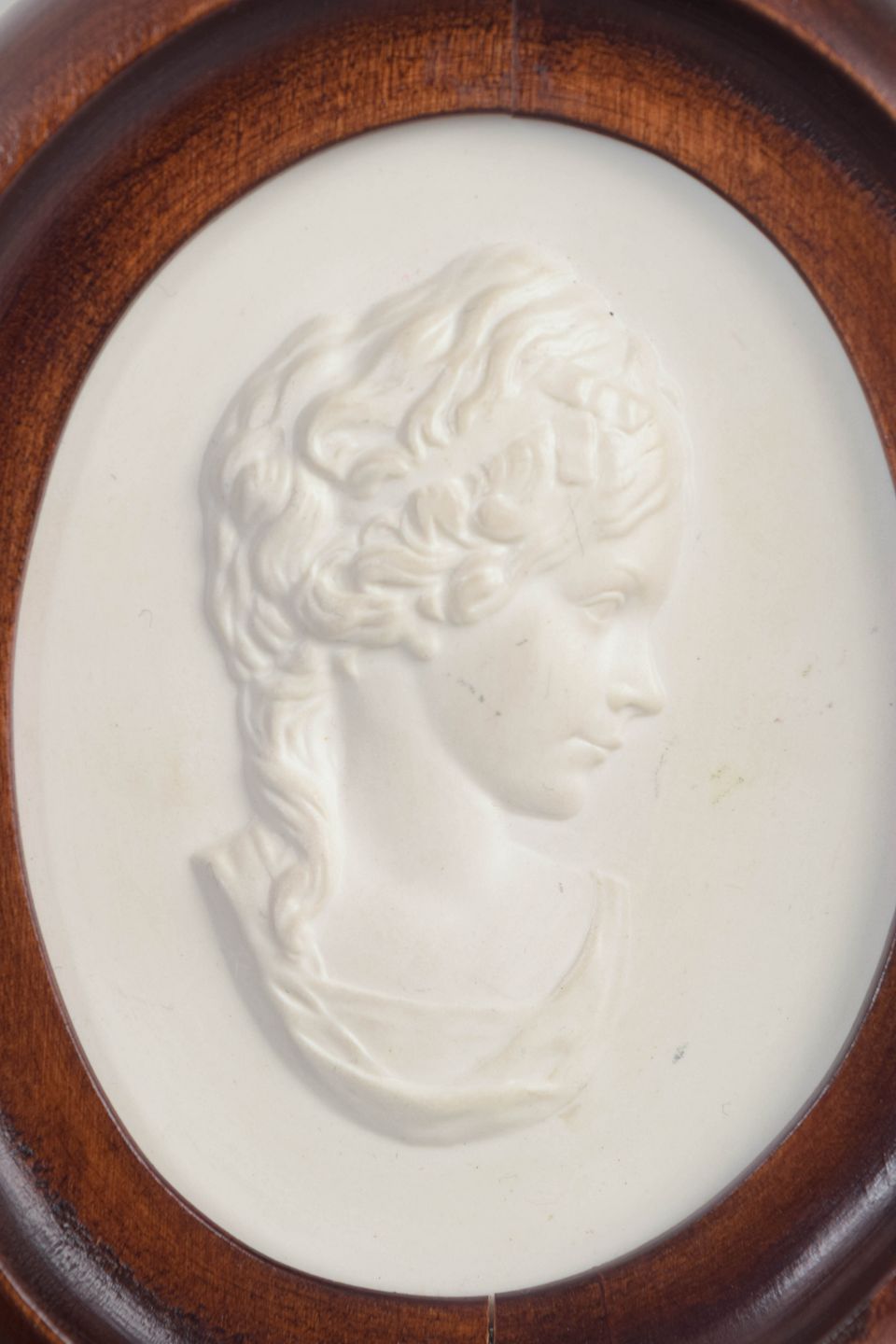Oval reliefplakette i hvid biscuit porcelæn med klassisk kvindeportræt i profil, monteret i profileret oval træramme. Den matte biscuit overflade fremhæver den fine modellering af hår og ansigt og giver et roligt, skulpturelt udtryk.