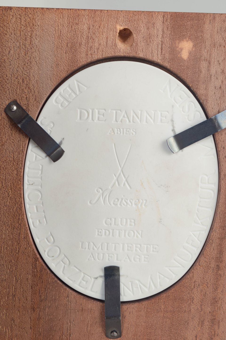 Reliefplakette i hvid biscuit porcelæn med stiliseret naturmotiv forestillende træer, monteret i rektangulær træramme med ovalt udsnit. Den matte overflade fremhæver relieffets fine modellering og giver et klassisk, skulpturelt udtryk.