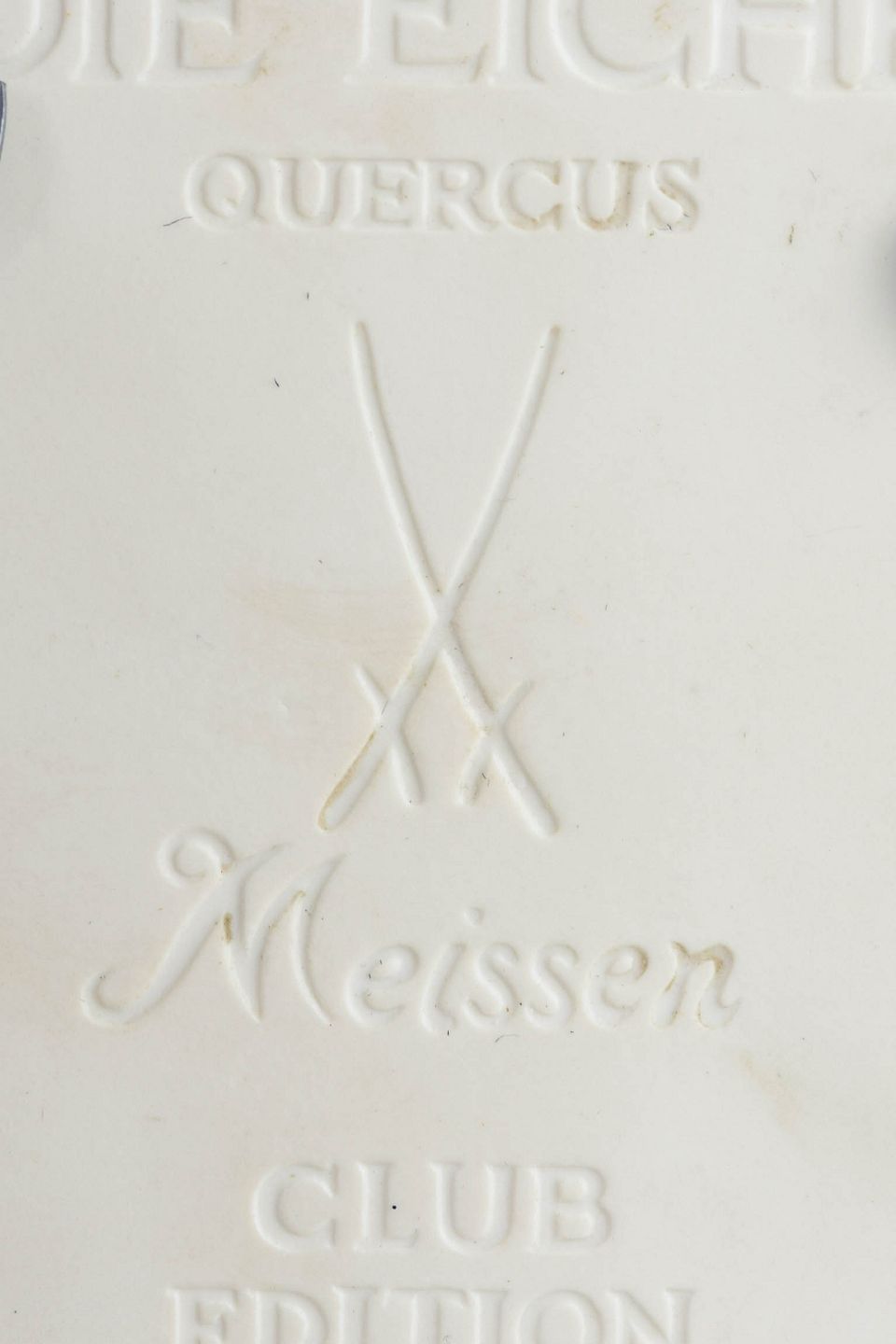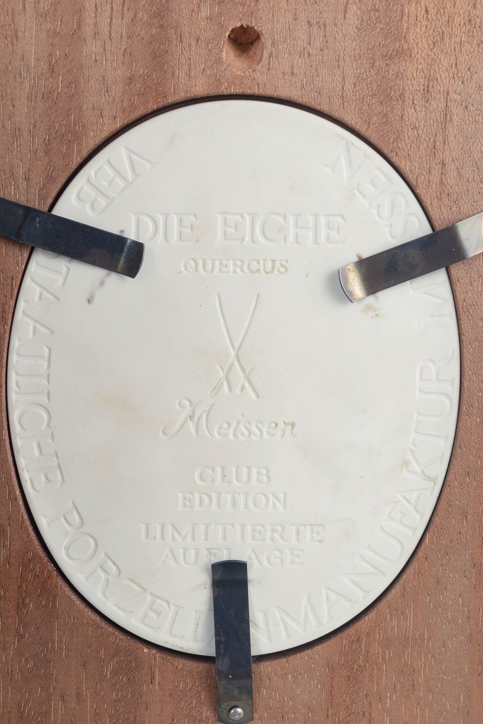 Reliefplakette i hvid biscuitporcelæn med naturalistisk motiv, monteret i rektangulær træramme med ovalt udsnit. Et dekorativt vægobjekt udført i klassisk Meissen-tradition, hvor den matte overflade understreger det plastiske relief.