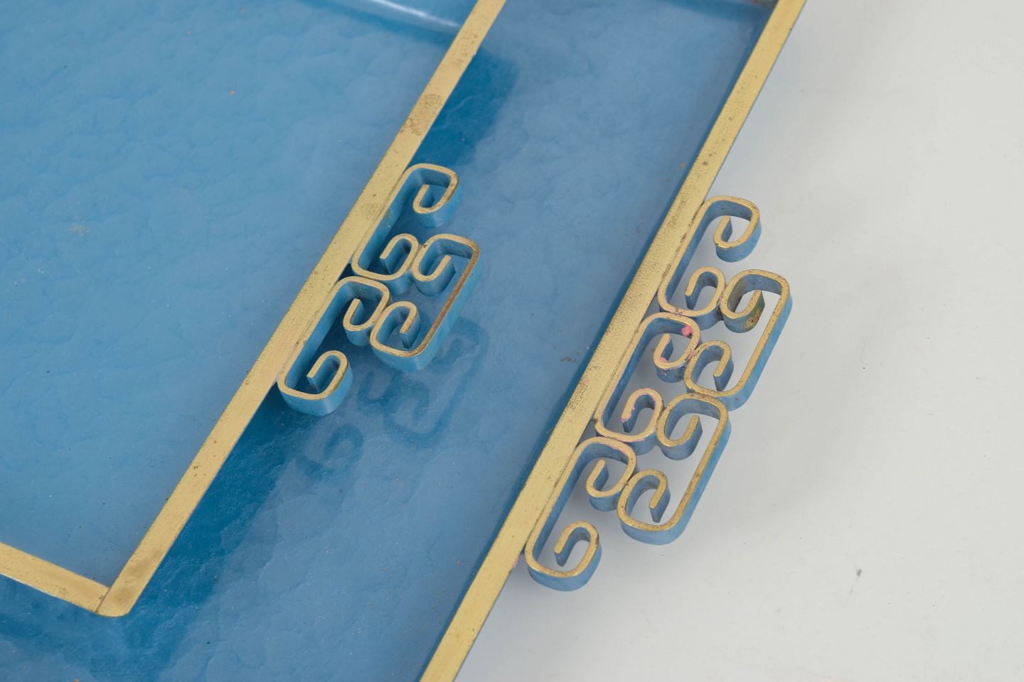 Sæt af håndlavede rektangulære emalje-bakker udført i messing med karakteristisk moiré-glasur i blå nuancer og kant i forgyldt messing. Fremstillet i Pasadena, Californien. Det stringente formsprog og den raffinerede overflade er typisk for Art Deco-periodens dekorative kunst.