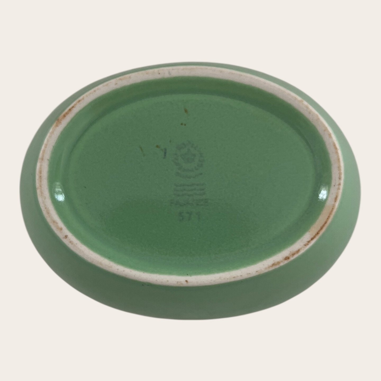Royal Copenhagen, Aluminia, Ursula, Oval skål, Grøn #571, 1. sortering, 10,5cm lang, 8cm bred, 6cm høj, Design Ursula Munch Petersen *Pæn stand*