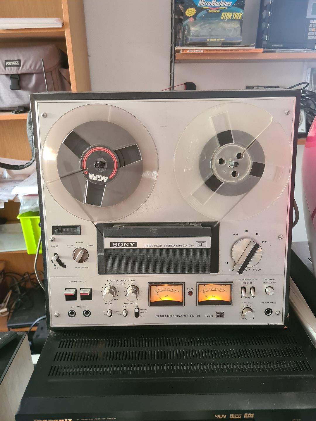 Spolebåndoptager fra Sony model TC-378. Fremstillet i 1977 og virker ok dog er counteren umiddelbart defekt. Trænger nok til lidt service både ydre og indre, men spiller som sagt udmærket. NB svagt indridset på fronten. (Billede)