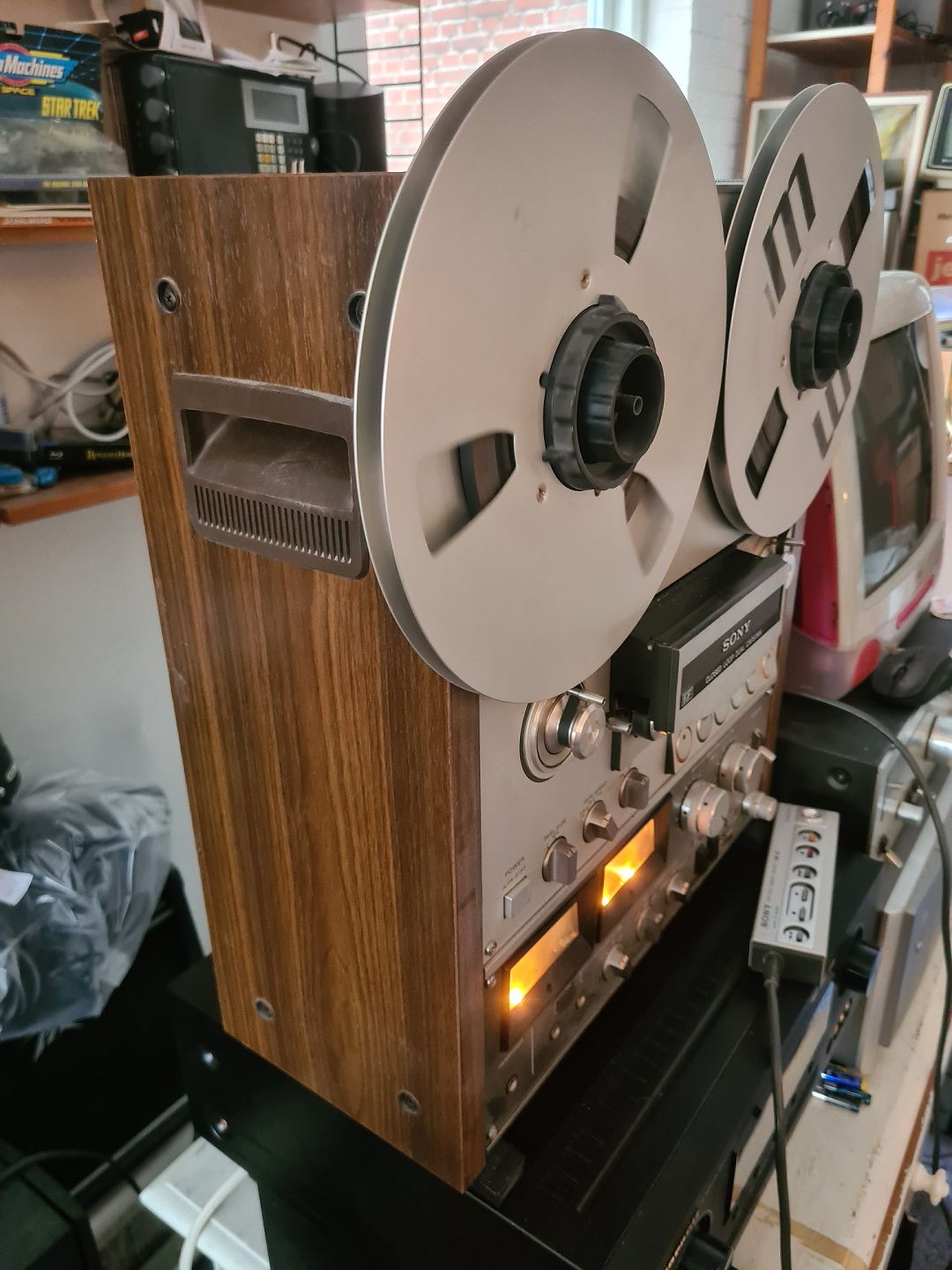 Spolebåndoptager fra Sony model TC-765. Fremstillet i 1979 og virker fint. Den kunne nok godt bruge en anelse service for at fremstå optimalt. NB svagt indridset på fronten. (Billede) Fjernbetjening model medfølger GM-30 medfølger. Den er ligeledes testet : Rewind virker ikke. Pause sporadisk og resten virker fint.