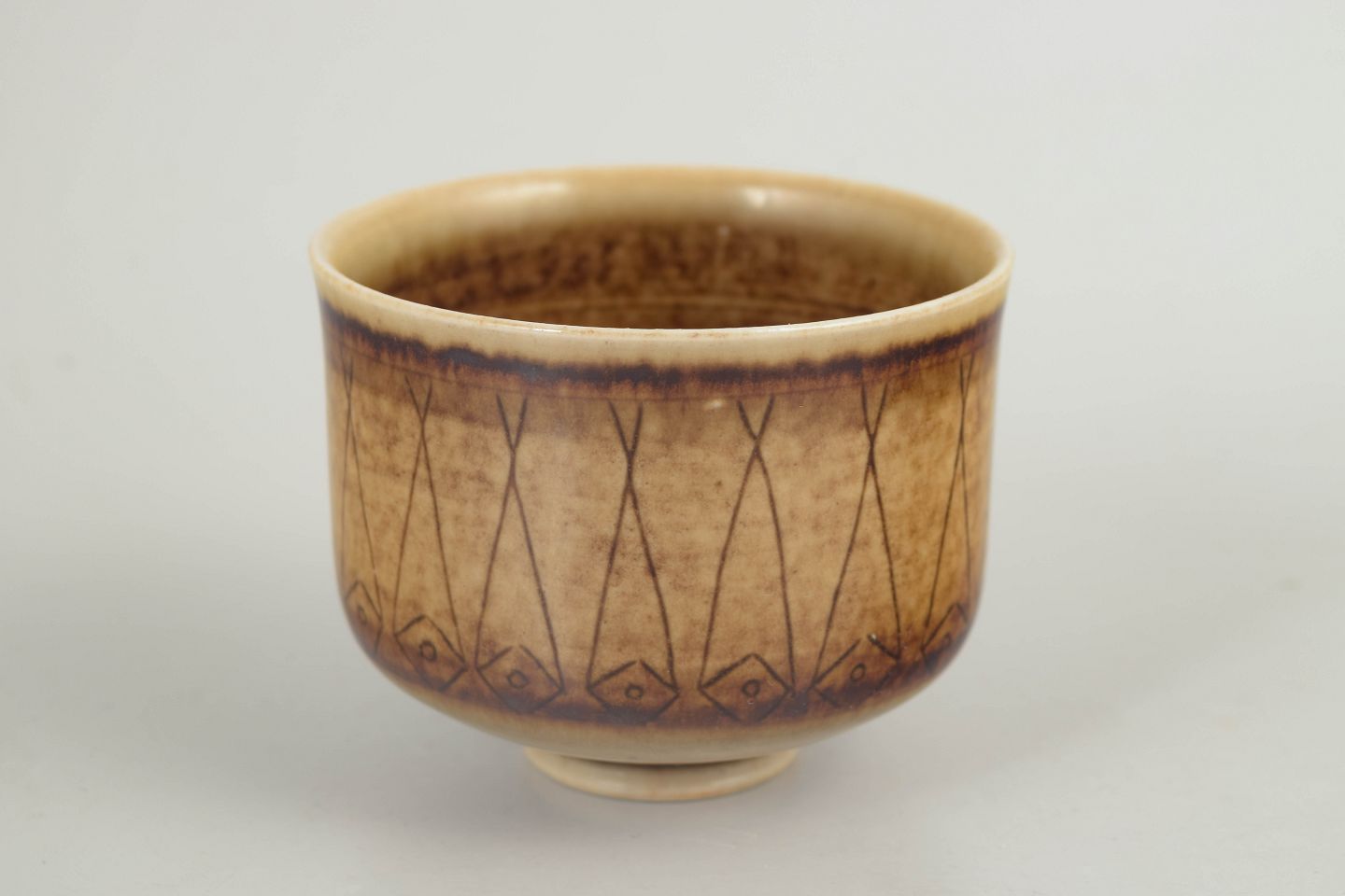 Drejet skål i stentøj med let fodring og afrundet krop. Udført med varm, brunlig glasur og indridset geometrisk dekoration i gentagne lodrette felter omkring ydersiden. Indvendigt ses en mere tæt, levende glasur. Signeret i bunden og fremstillet hos Höganäs i 1970’erne.
