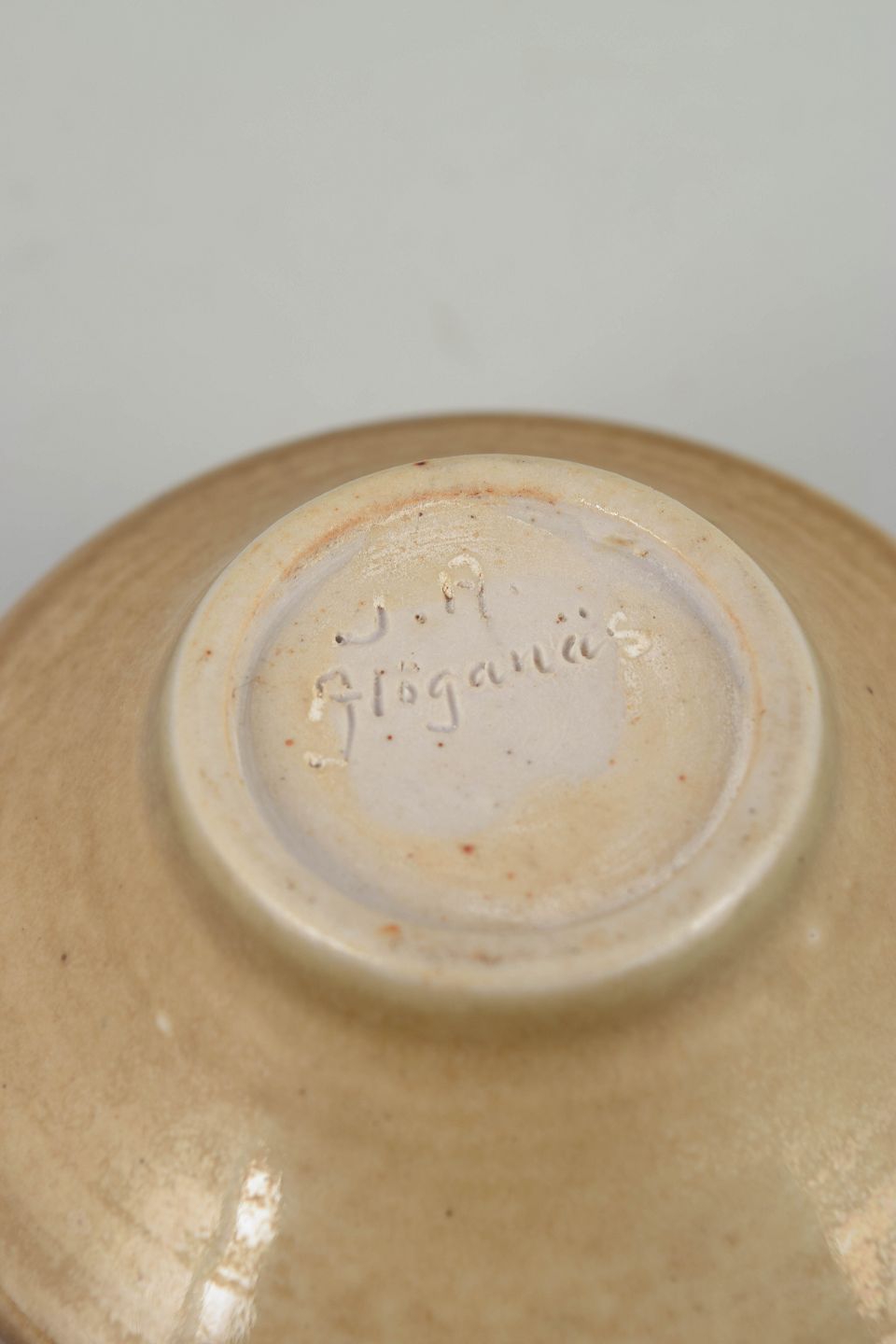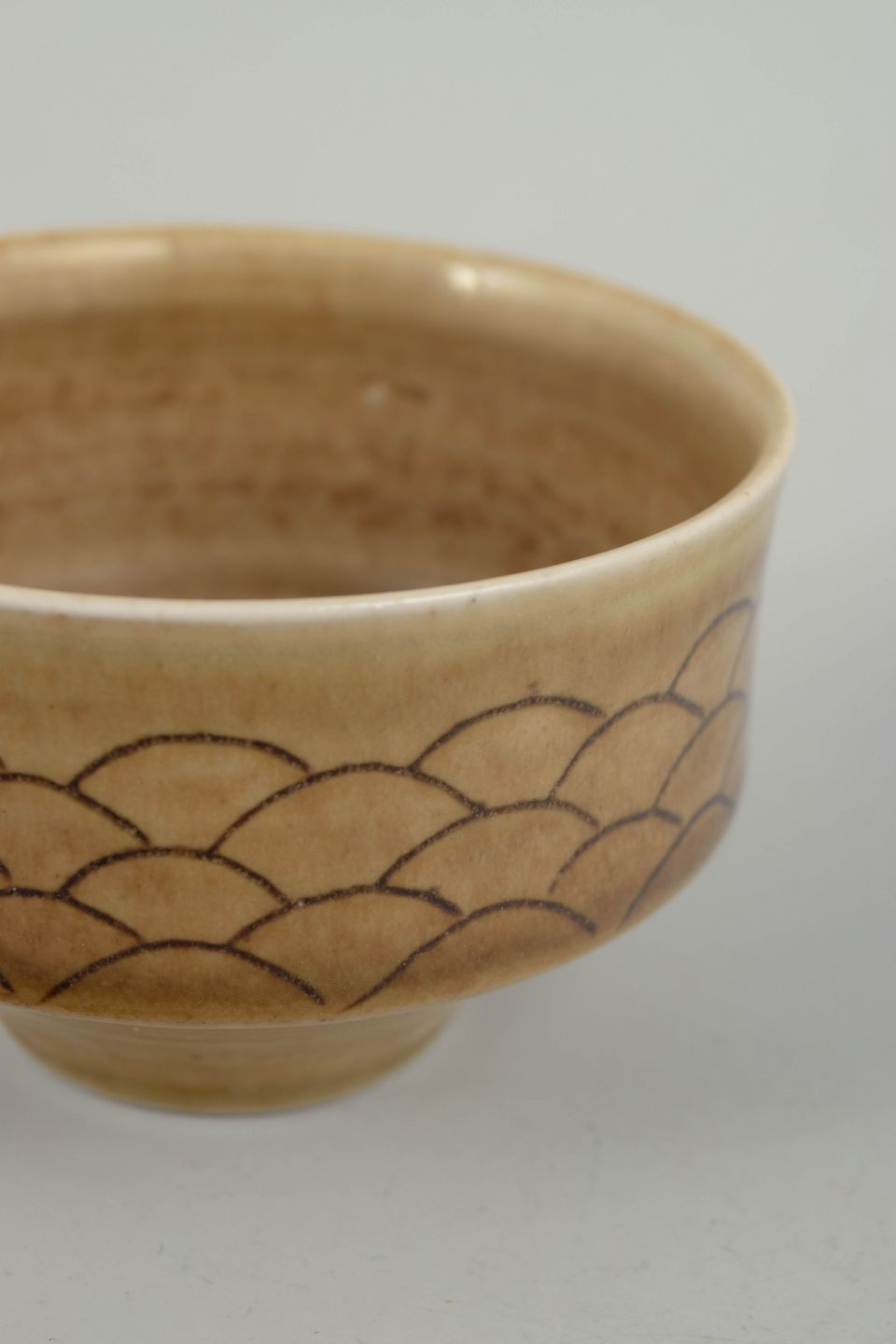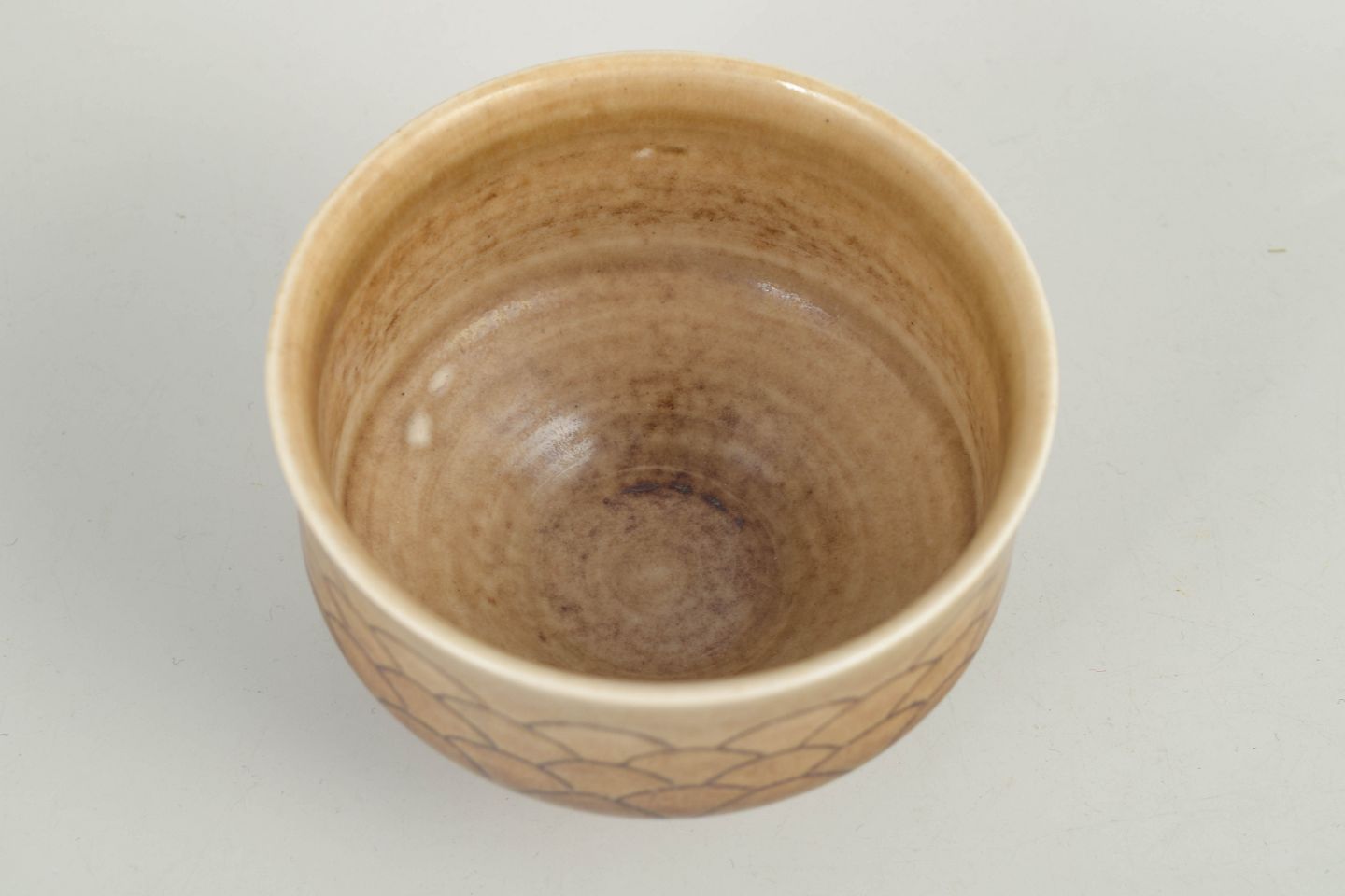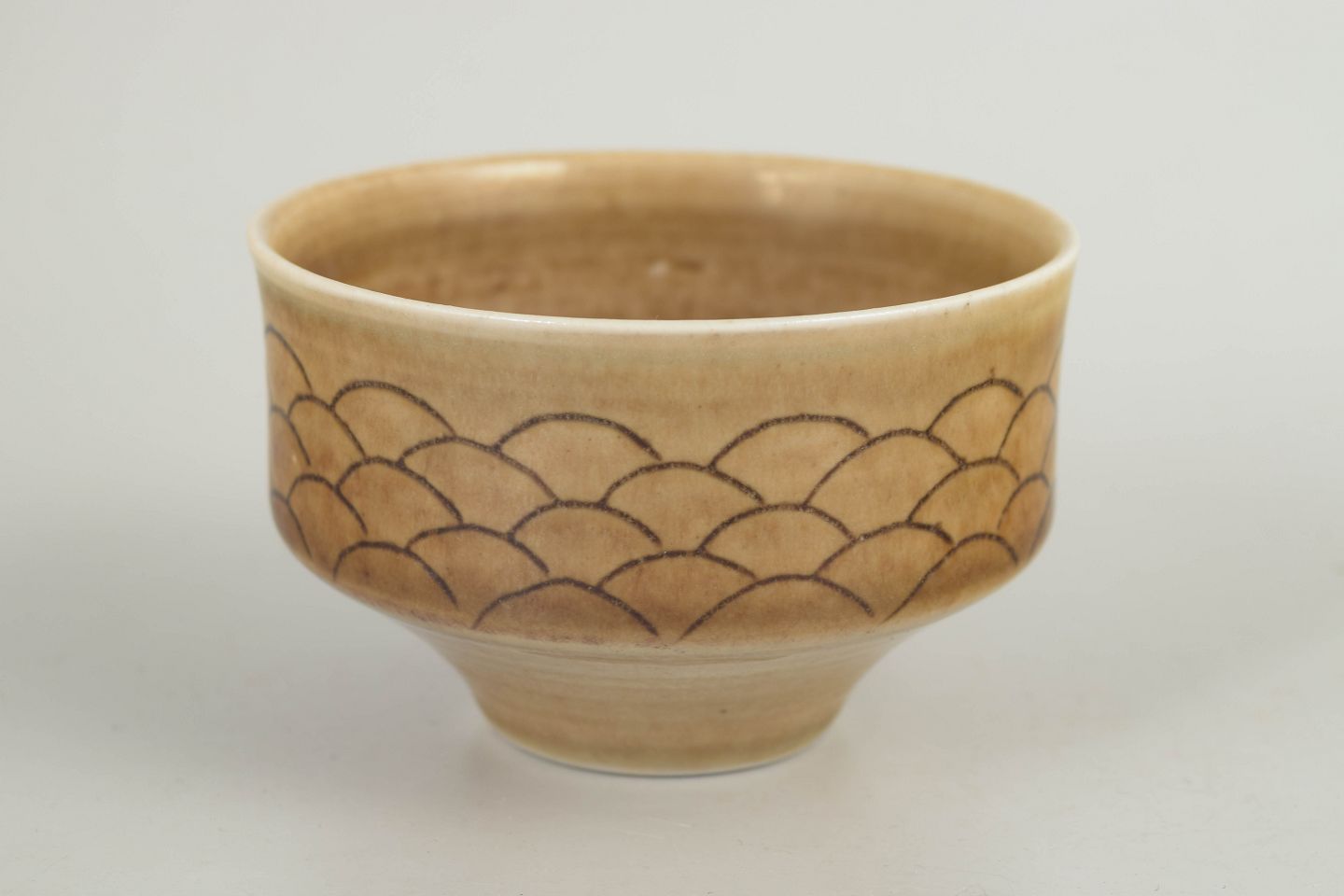Drejet skål i stentøj med let udadbøjet kant og varm, sandfarvet glasur, dekoreret med indridset, skælformet mønster langs ydersiden. Signeret i bunden, udført hos Höganäs i 1970’erne.