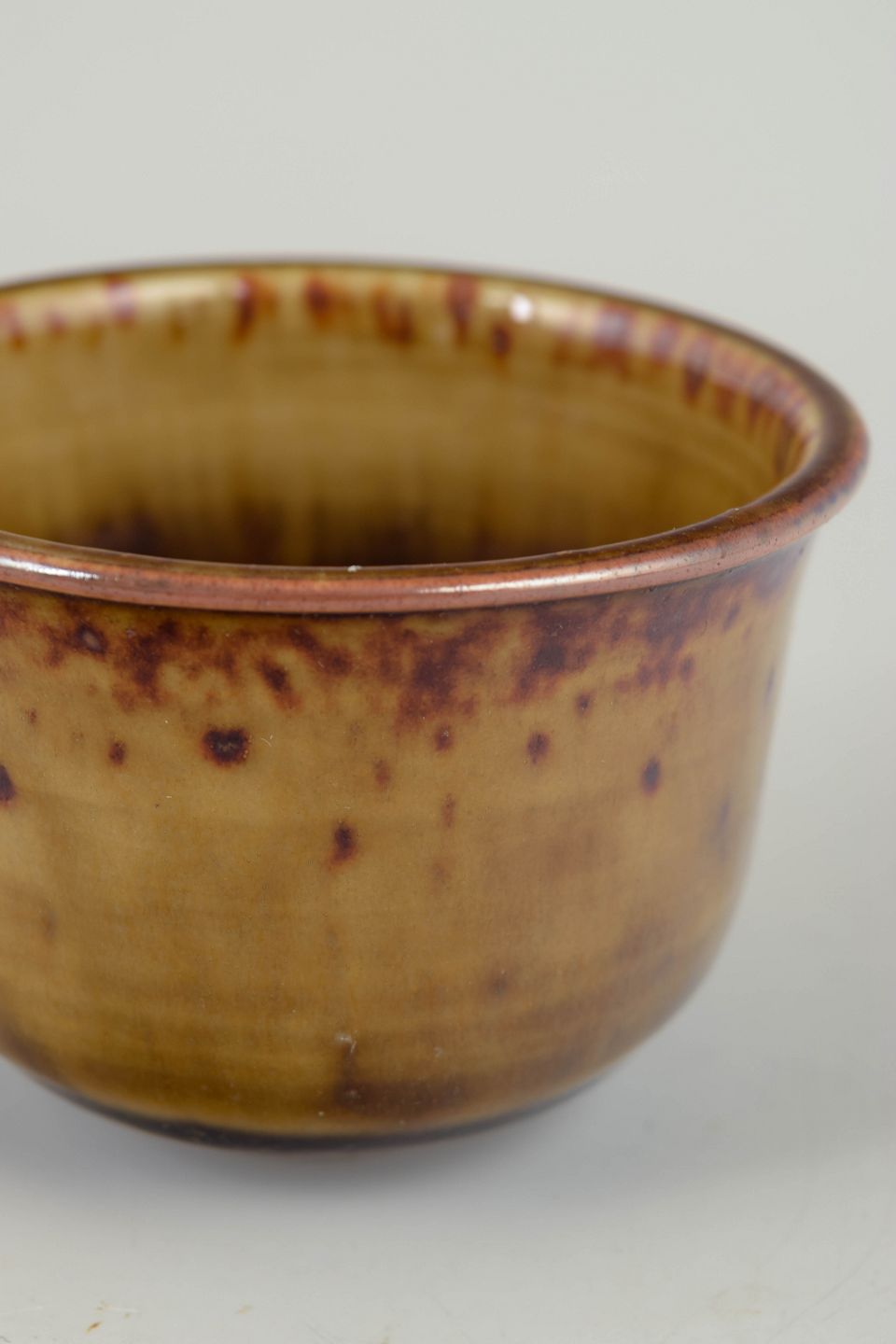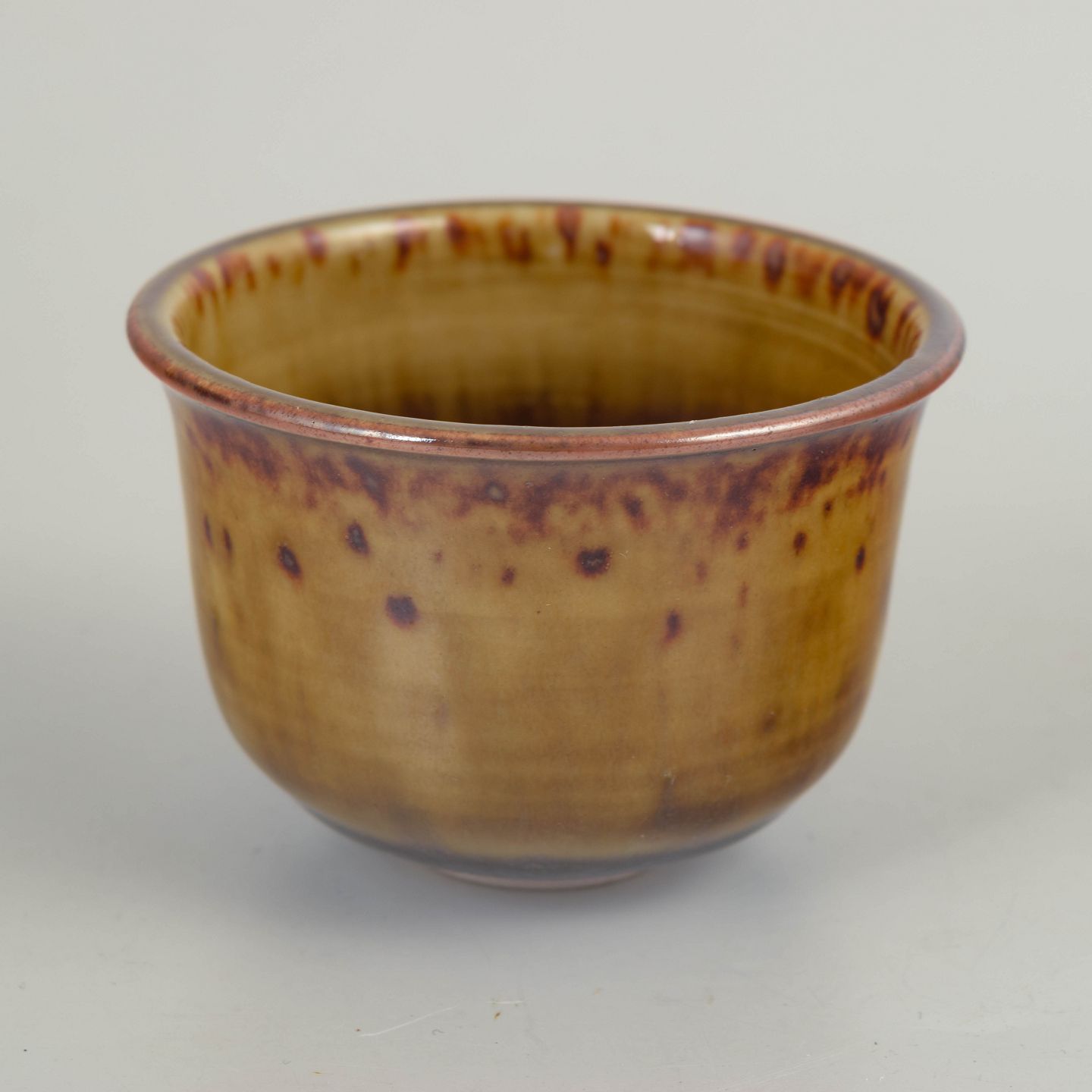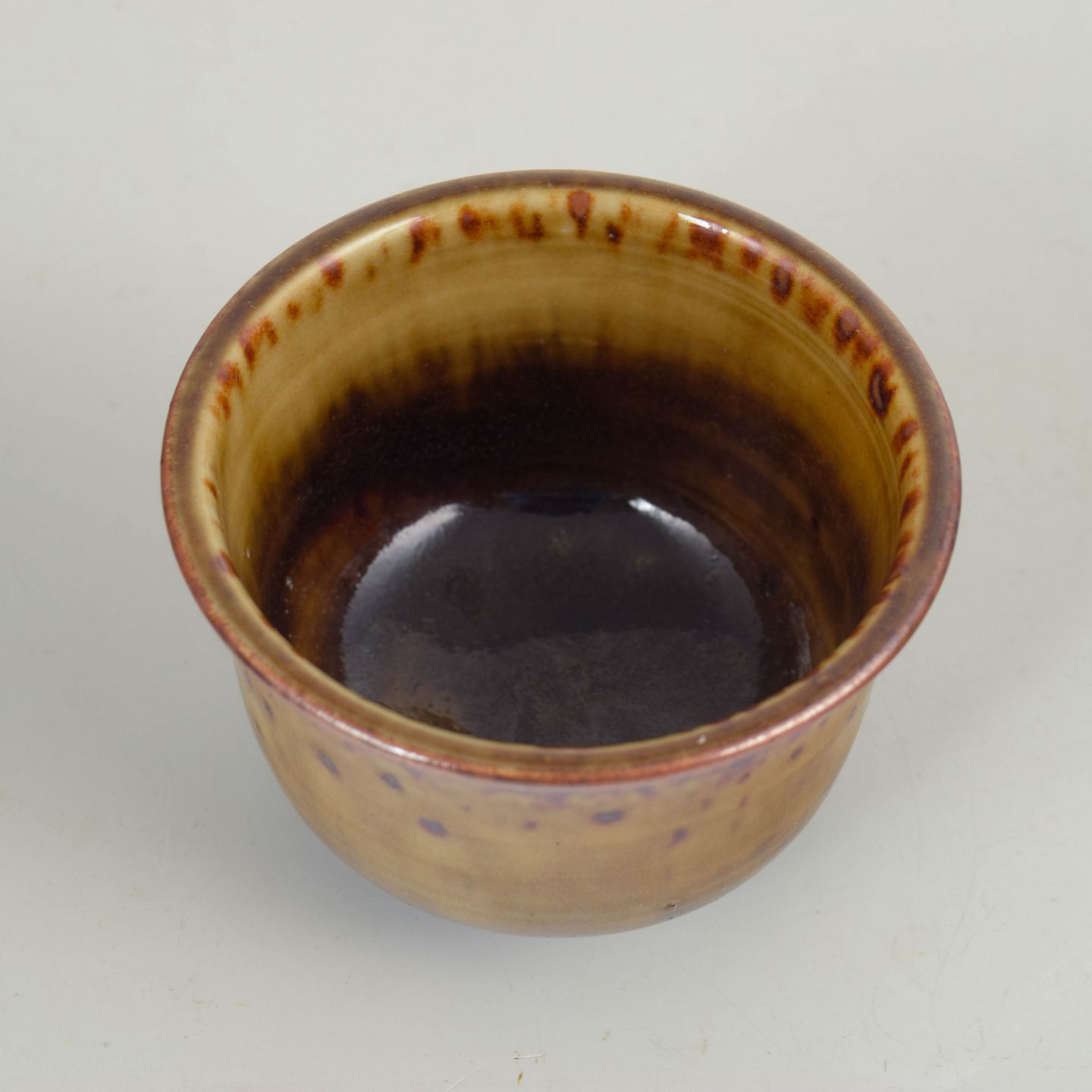 Drejet skål i stentøj med let udadbøjet kant og varm honningbrun glasur, dekoreret med mørkere, spættede nuancer langs randen. Signeret i bunden, udført hos Höganäs i 1970’erne.
