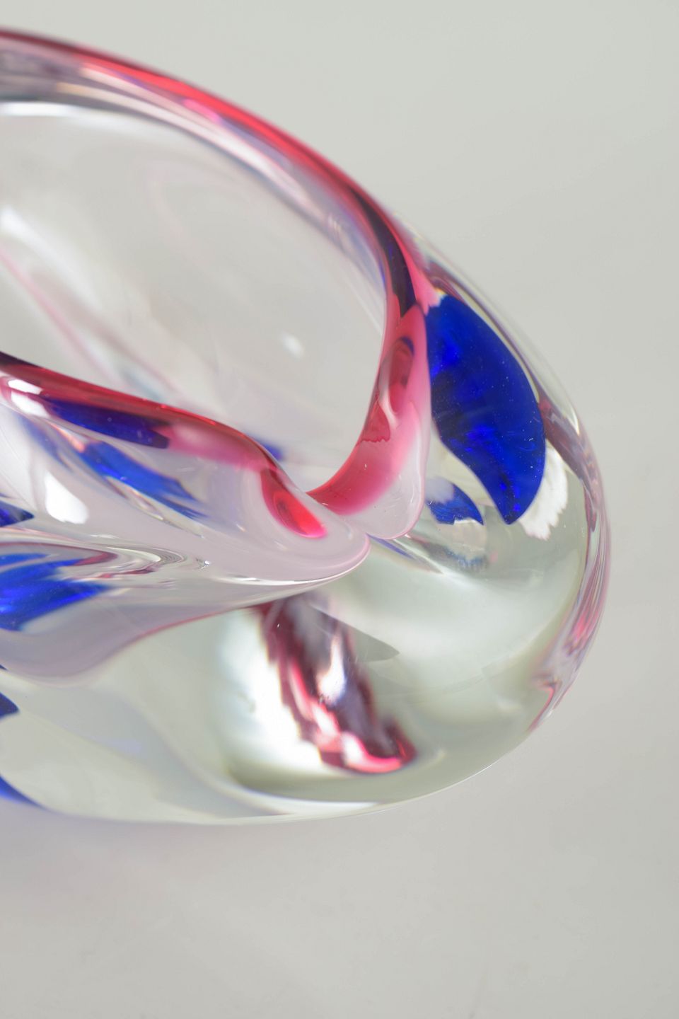 Organisk formet skål i mundblæst kunstglas med lagdelt sommerso-teknik. Klar glasmasse med indkapslede farvefelter i blå og rosa, der skaber dybde og et karakteristisk svævende farvespil. Typisk Murano-arbejde fra 1960’erne/70’erne med bløde, skulpturelle linjer.