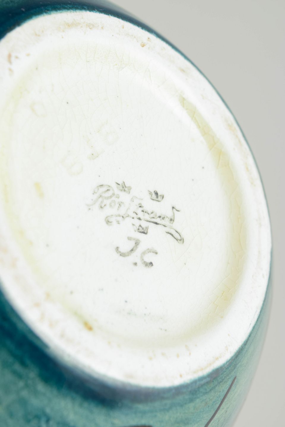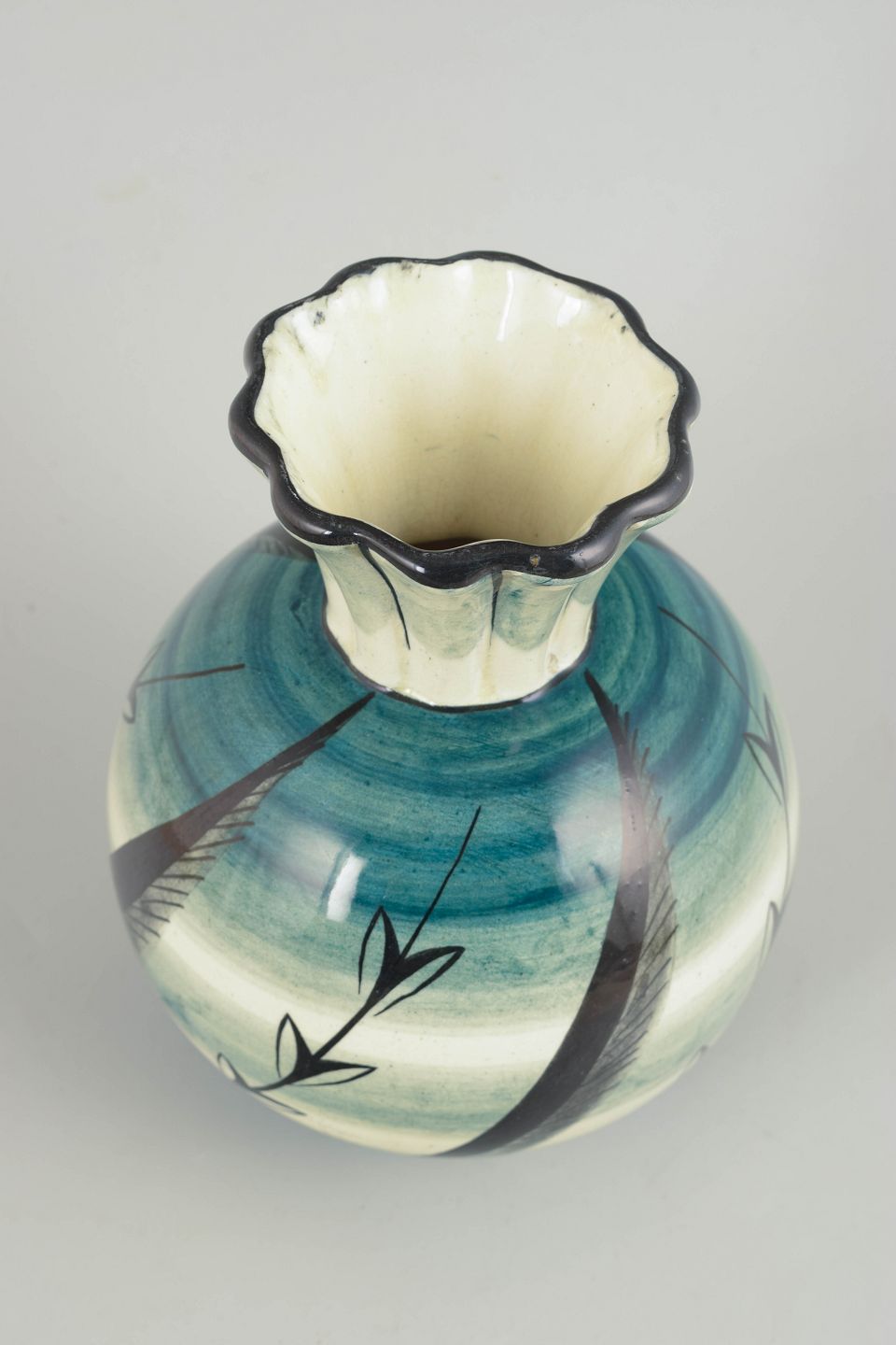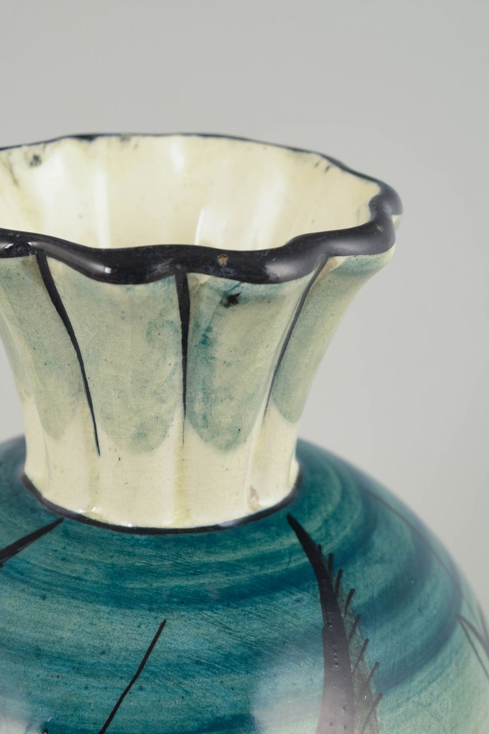 Art Deco-vase i fajance med balanceret, rund korpus og smal hals med let bølget rand. Dekoreret i karakteristiske blågrønne nuancer med stiliseret plantedekoration og fine penselstrøg, udført i den velkendte “Löja”-dekoration, udviklet i 1930’erne. Modellen fremstår som et klart eksempel på svensk Art Deco med inspiration fra naturformer og grafisk ornamentik.