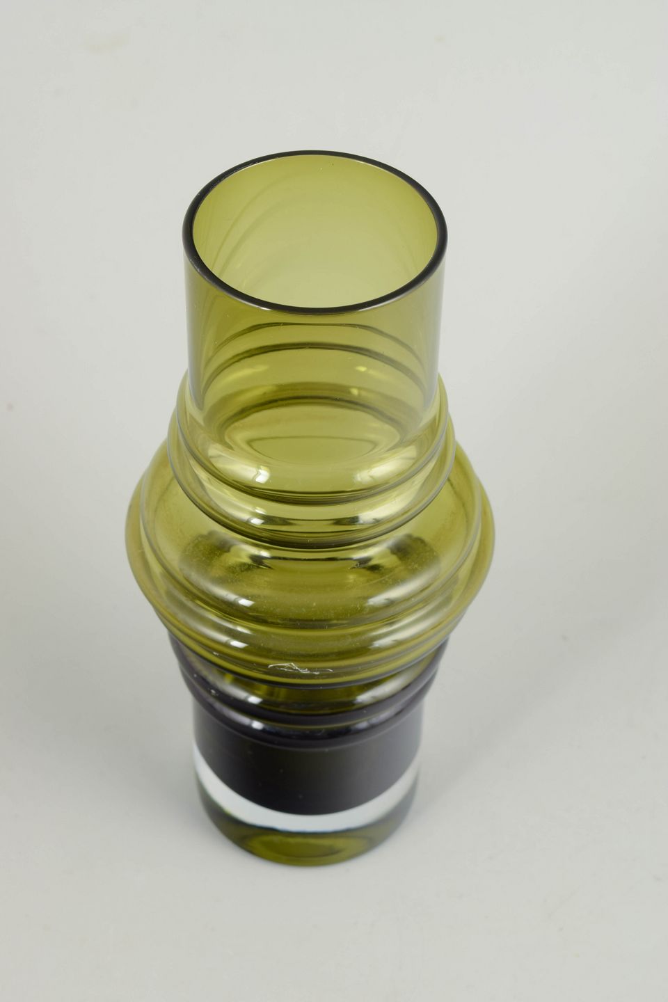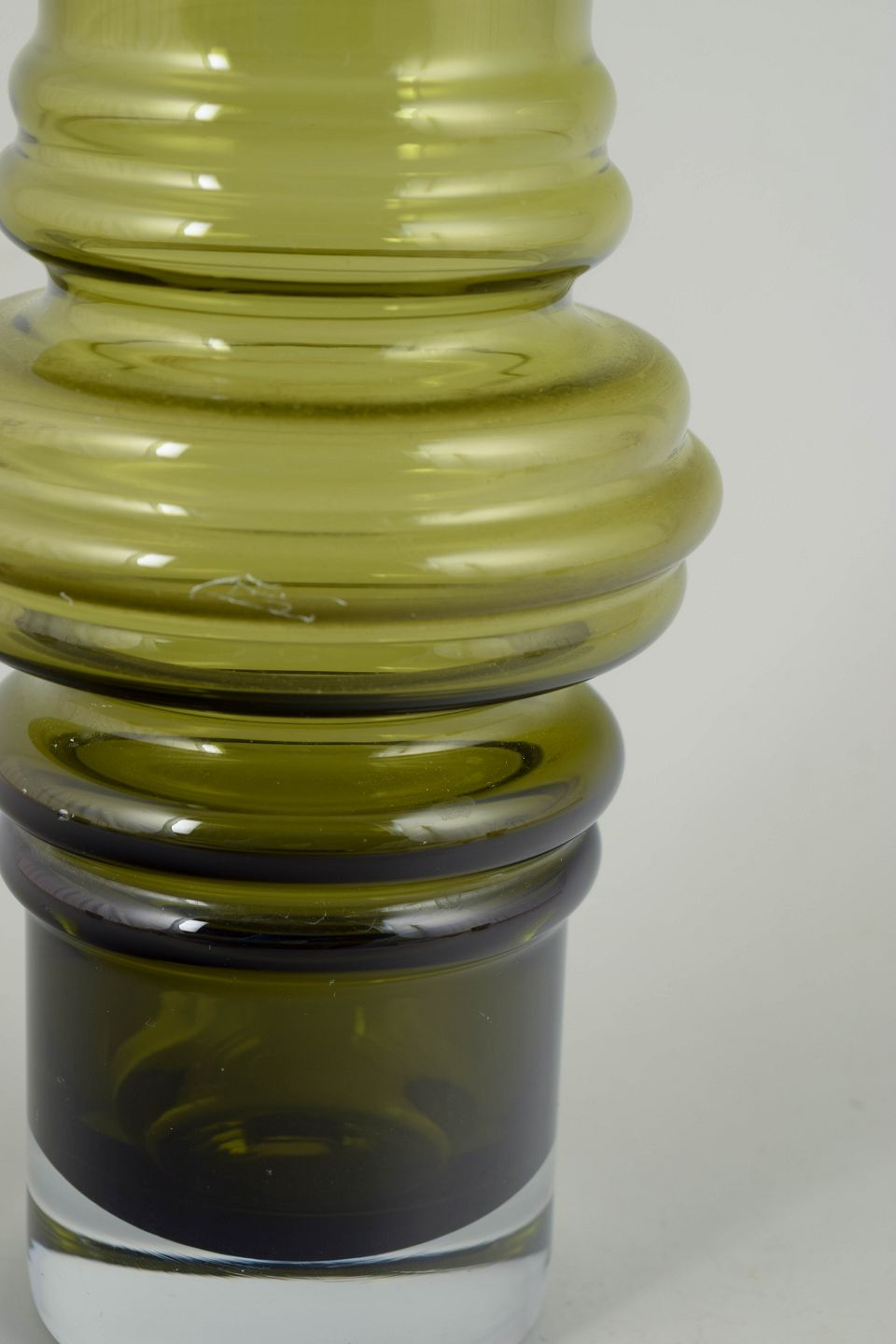 Elegant vase i olivengrønt glas med balanceret, skulpturel profil og blød, afrundet form. Mundblæst udførelse med markeret, ringformet midterparti og cylindrisk overdel, typisk for finsk kunstglas fra 1970’erne.