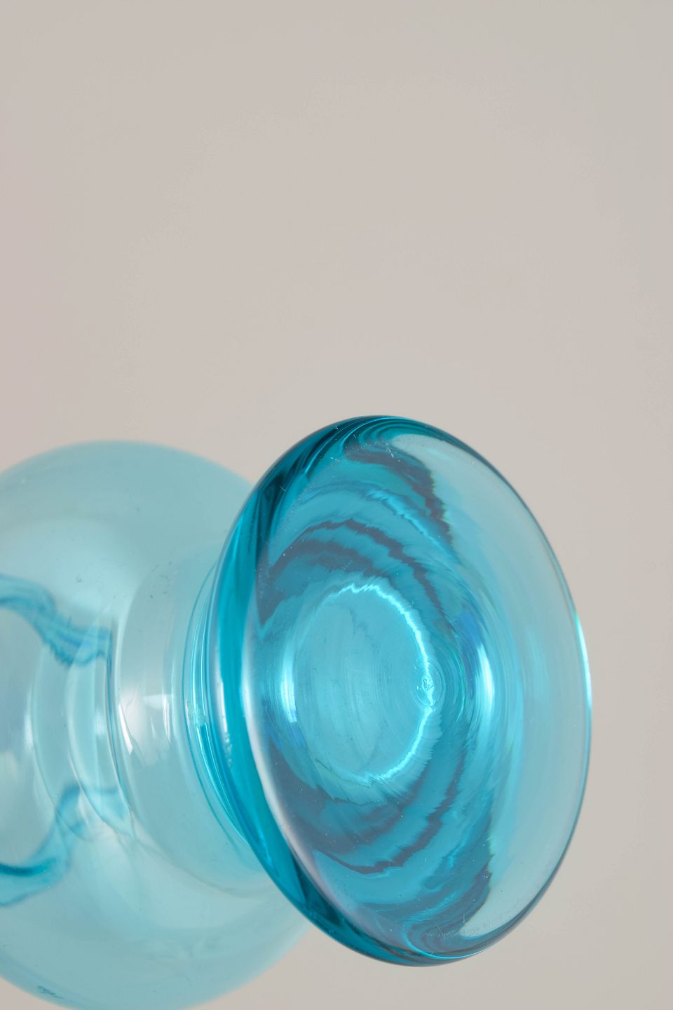 Elegant vase i klart turkisblåt glas med balanceret, skulpturel profil og blød, rundet krop. Mundblæst udførelse med let udadbøjet hals og fod, typisk for finsk kunstglas fra 1970’erne.