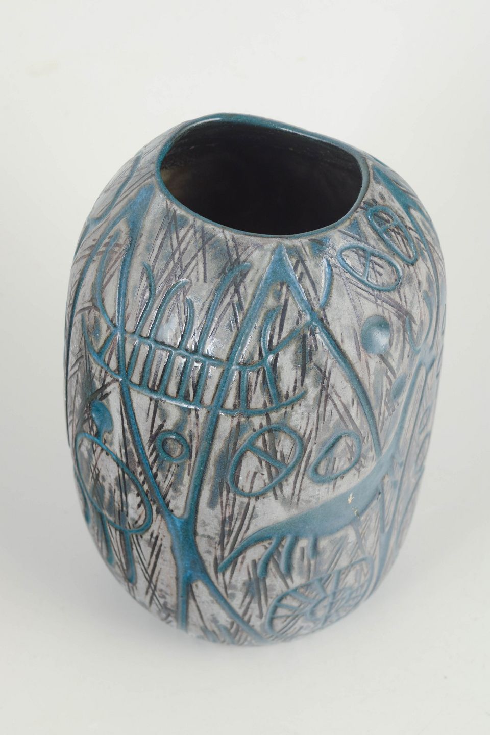 Dekorativ vase i glaseret keramik med reliefdekoration i blågrønne nuancer mod grå bund. Overfladen er rigt ornamenteret med stiliserede figurer og symbolske motiver, karakteristisk for Mari Simmulsons arbejder fra 1960’erne. Vasen er udført som model 4305 fra serien Hedenhös og fremstår med et tydeligt kunstnerisk og fortællende udtryk.