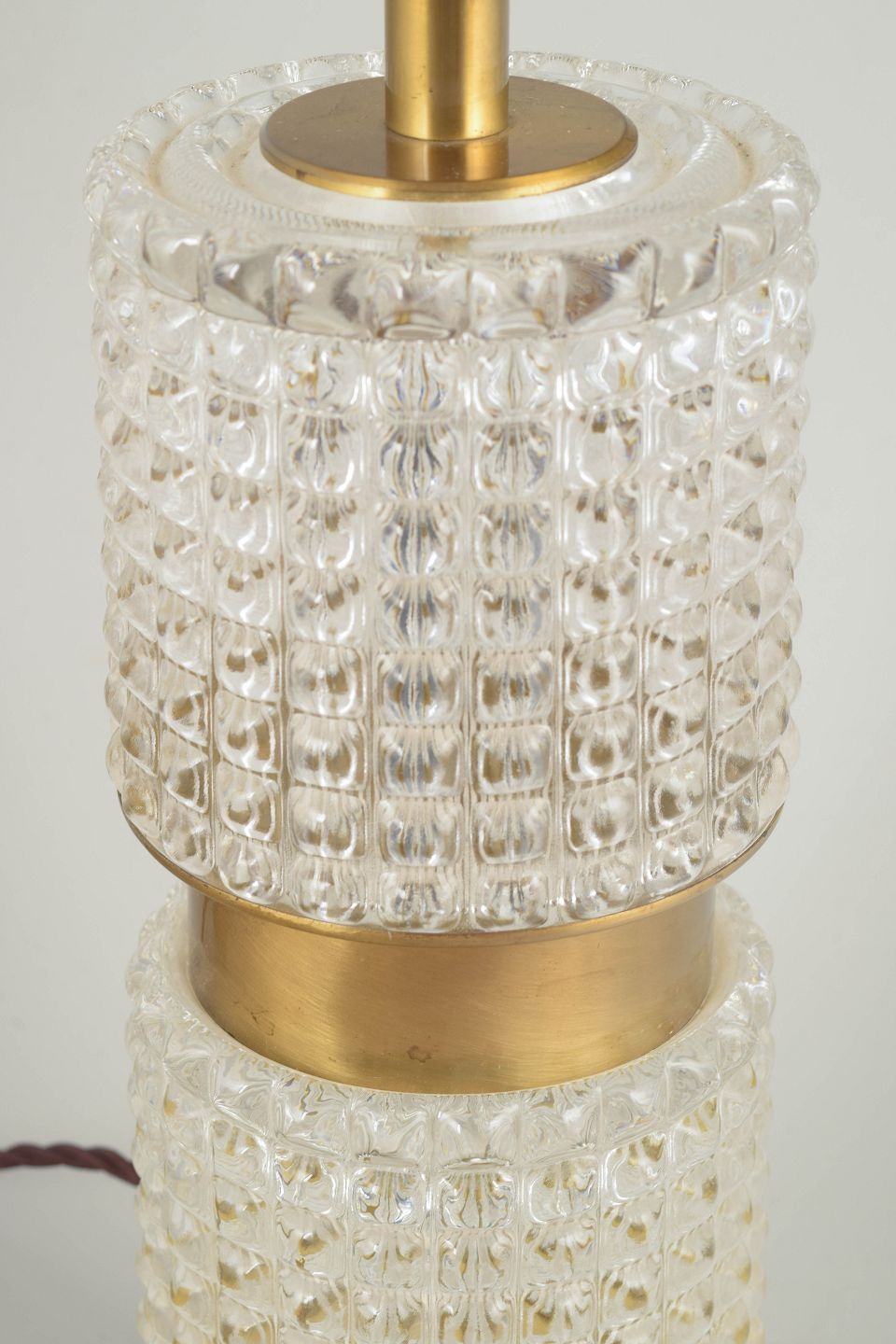 Elegant bordlampe i messing med to cylindriske partier i presset glas og varm gylden finish. Modellen er Aneta B515. Lampen er monteret med stofskærm dekoreret med botanisk mønster efter forlæg af Josef Frank. Et karakteristisk eksempel på skandinavisk belysningsdesign fra midten af det 20. århundrede, hvor funktionalitet kombineres med et dekorativt udtryk.