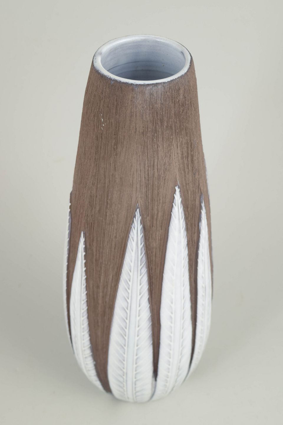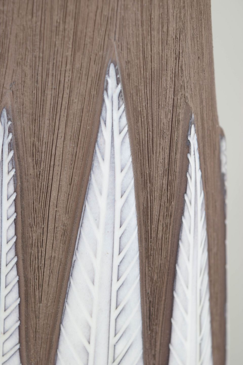 Elegant vase i stentøj med karakteristisk reliefdekoration inspireret af paprikaformede blade, udført i kontrasterende glasurer i jordfarvede og lyse toner. Et ikonisk design med klar tilknytning til svensk midten-af-århundredet keramik.