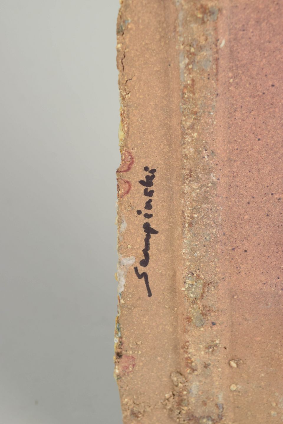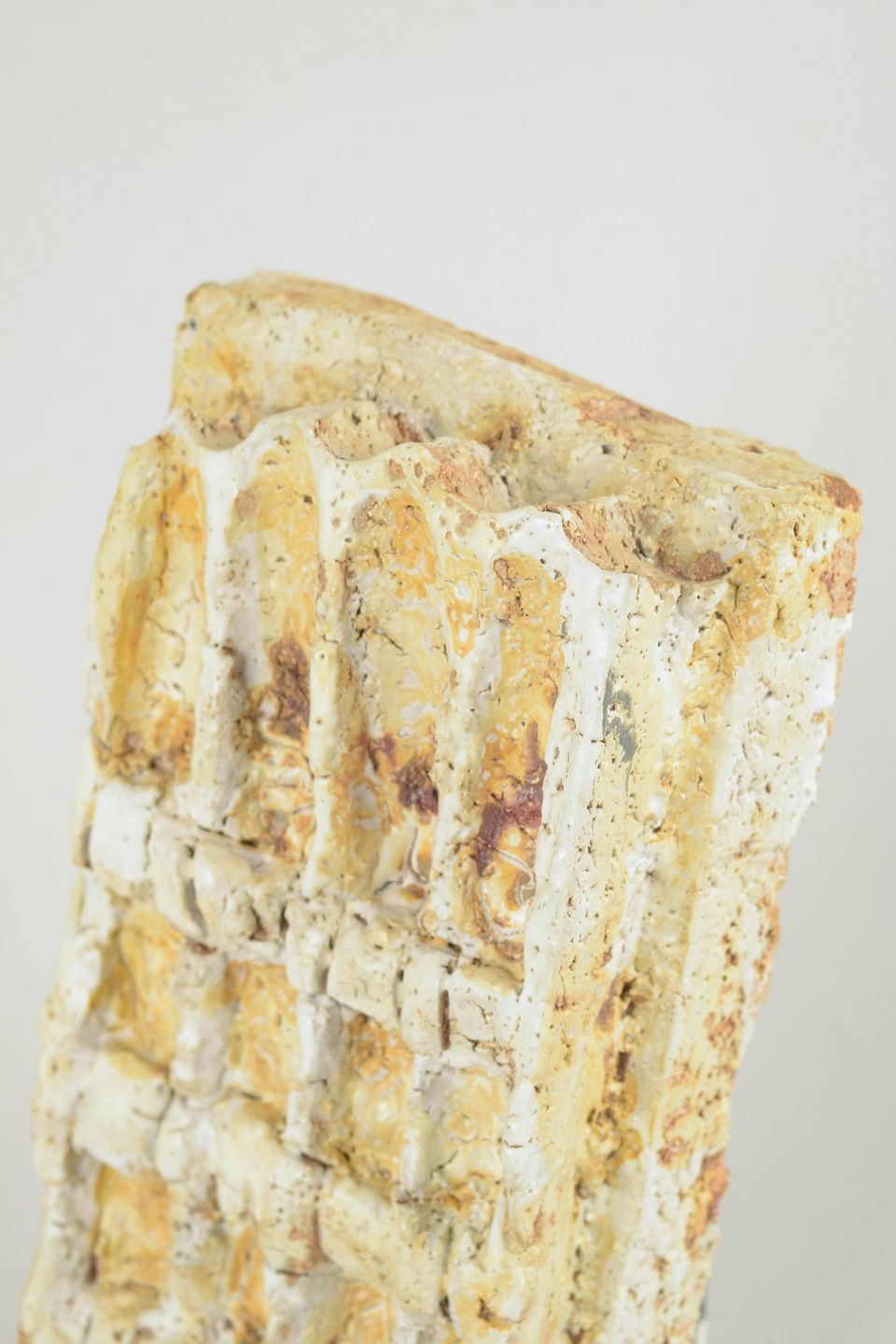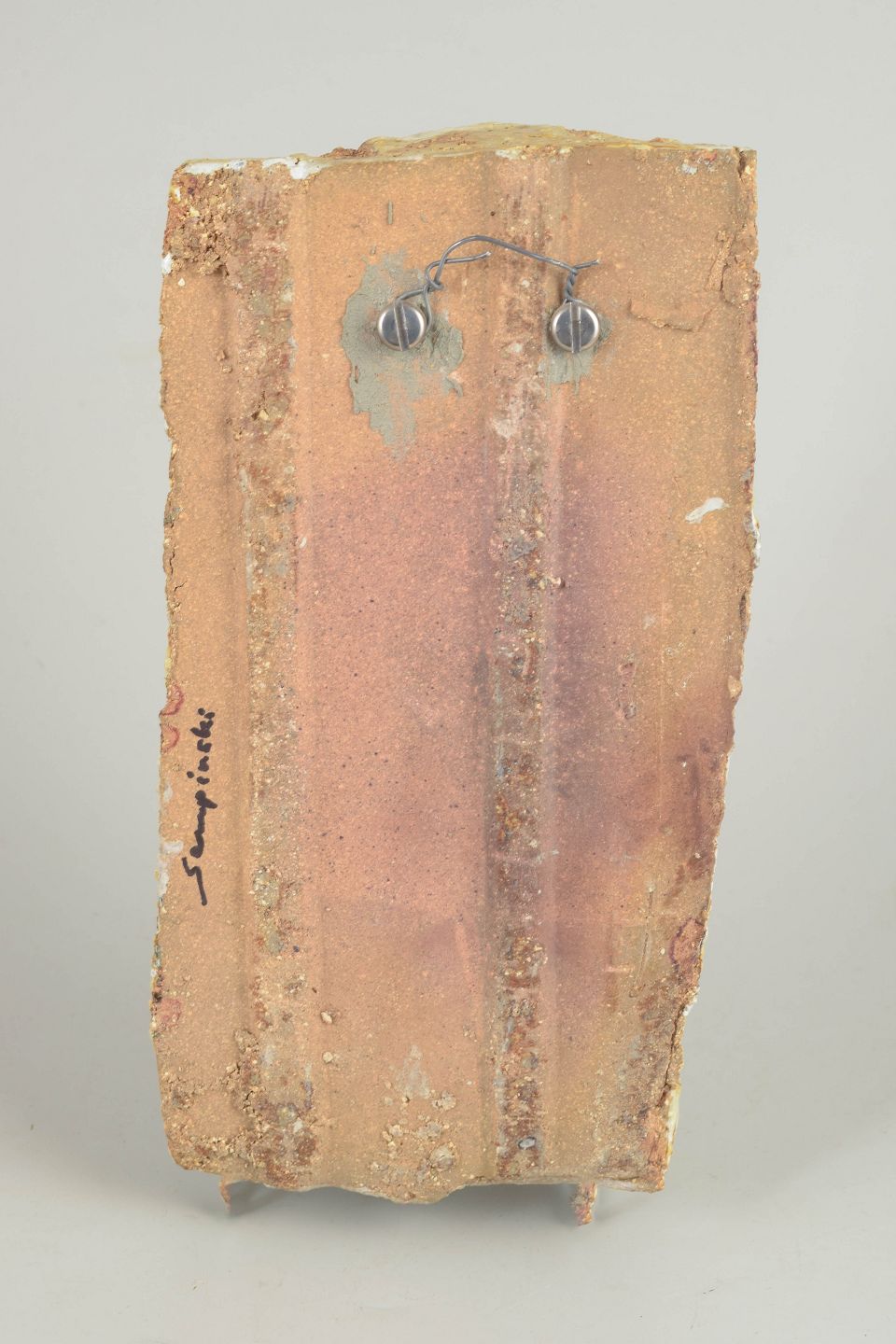Abstrakt, brutalistisk vægrelief i stentøj med kraftig, struktureret overflade og reliefornamentik. Naturlige jordfarver i creme, okker og brune nuancer. Unikt, håndlavet værk, signeret.